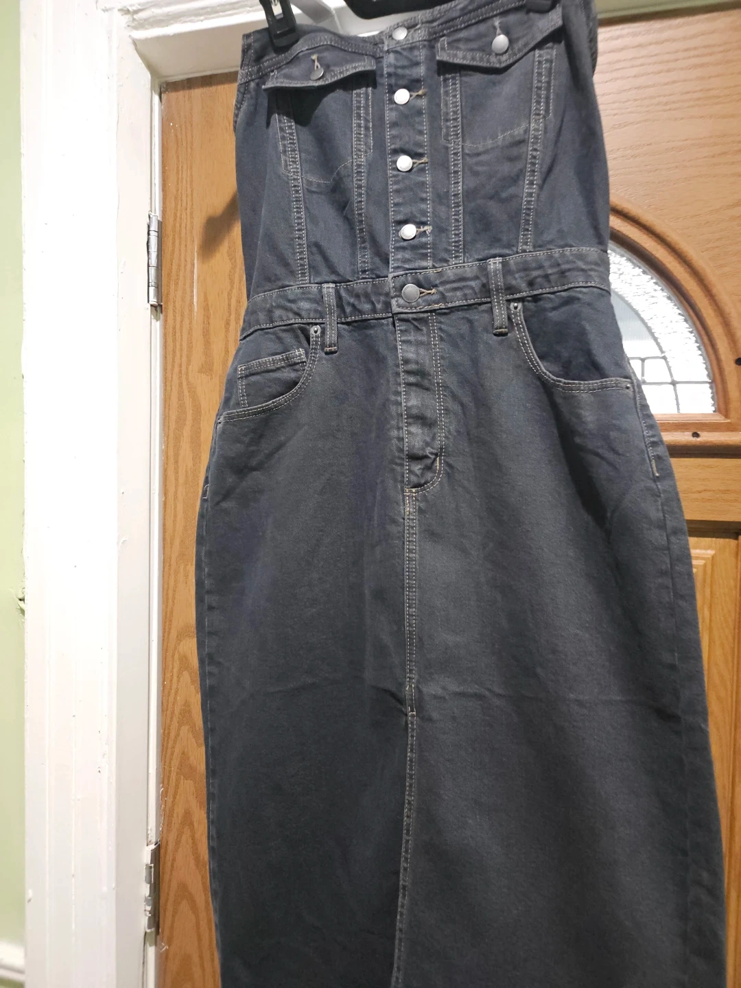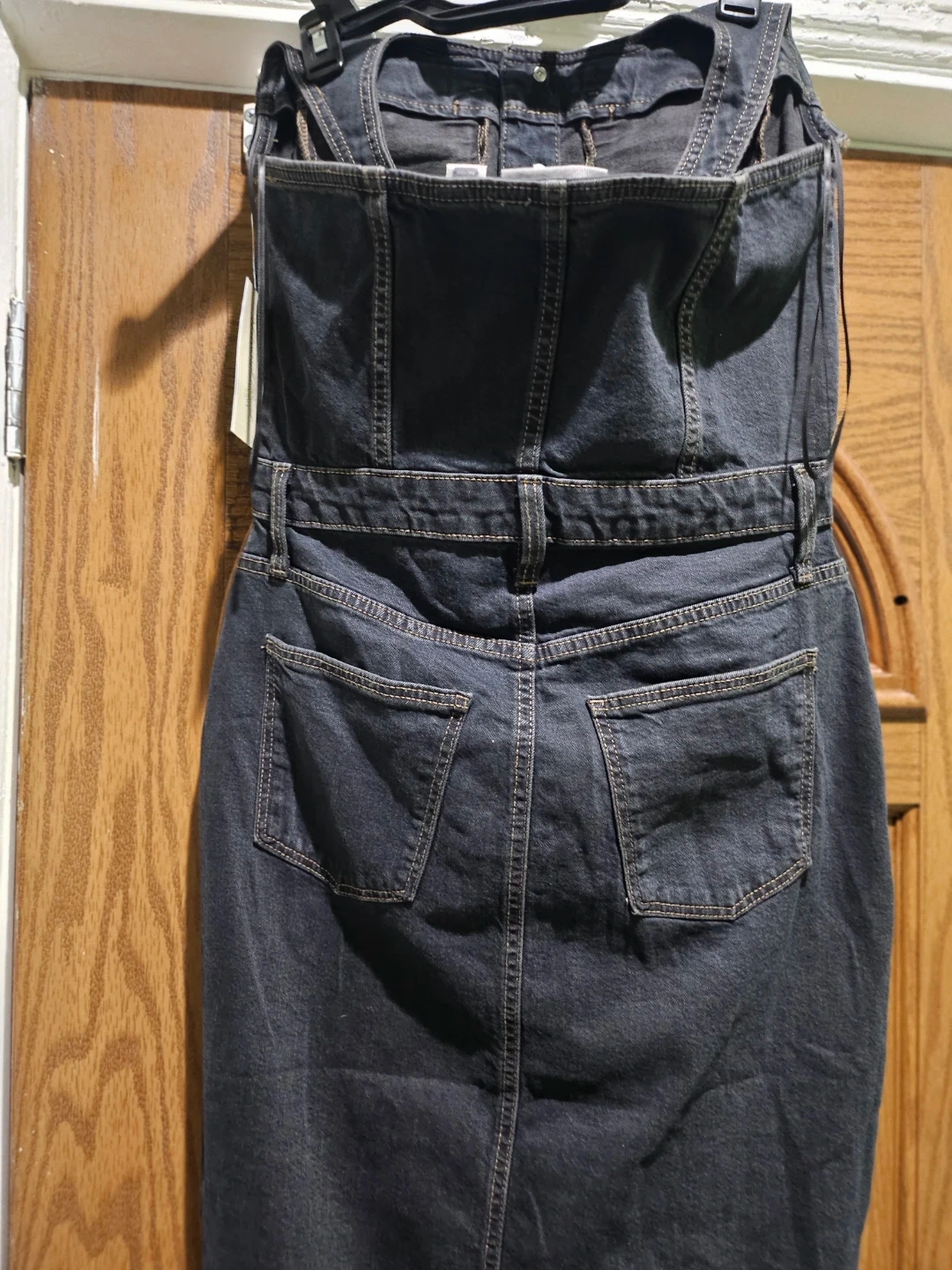This is a Universal Thread denim midi dress. It's black and has a classic overall style. Size 8.