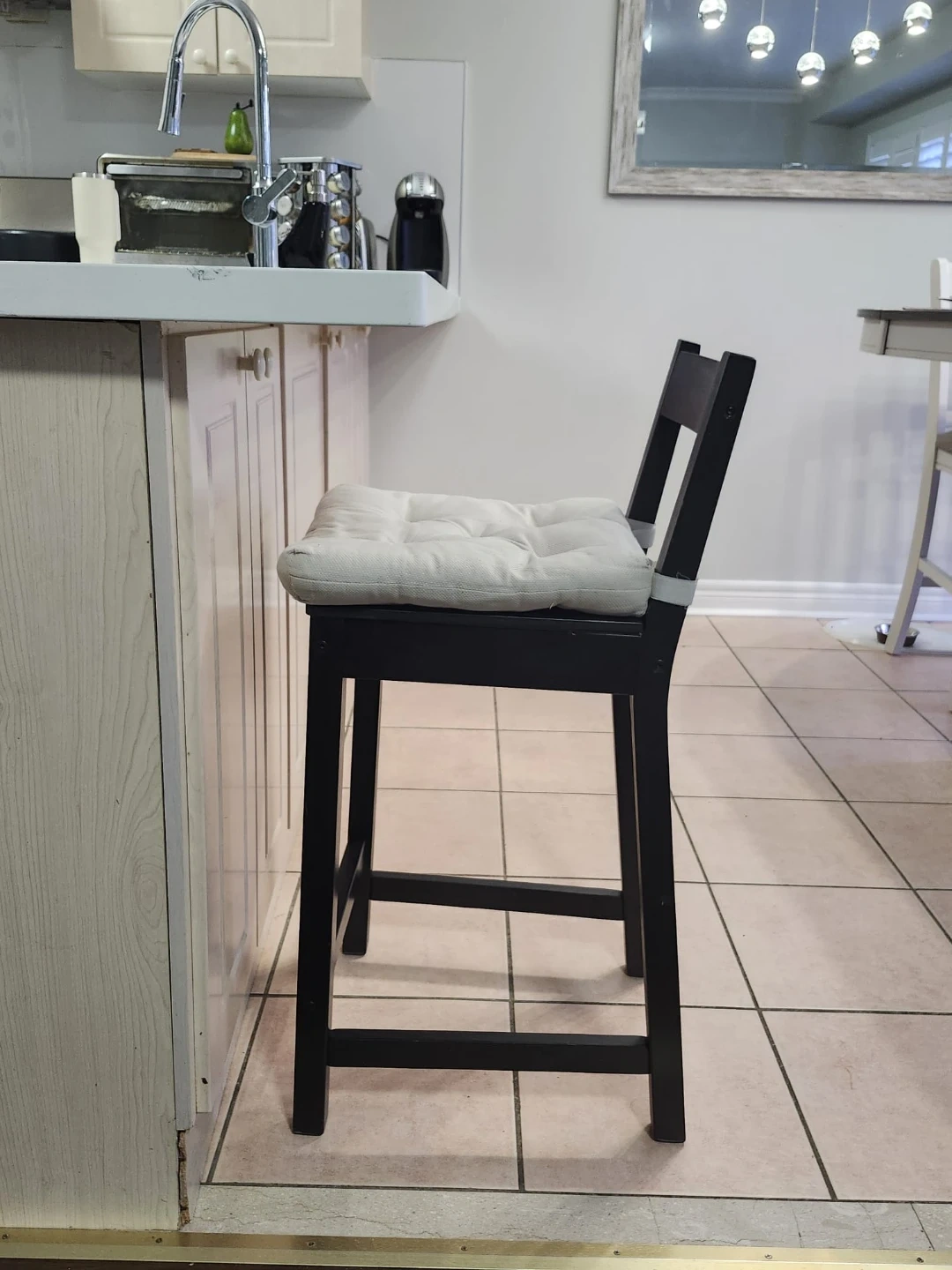 Set of three black wooden bar stools. Includes three white seat cushions and three red seat cushions. Perfect for a kitchen island or home bar. Brand Ikea. Set price.