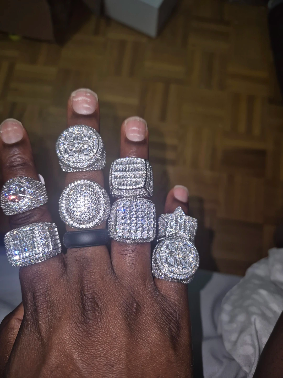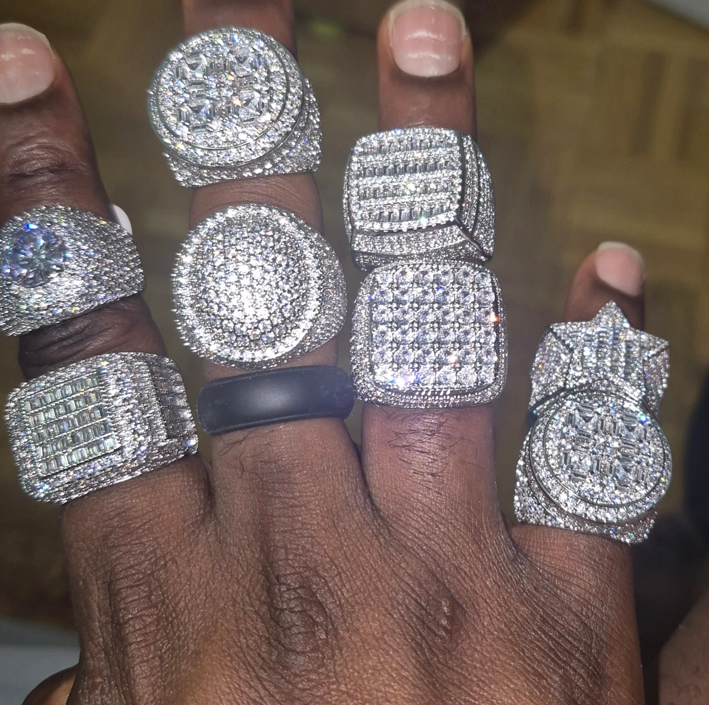 Collection of iced-out rings with various designs. Features baguette and round-cut stones. Great for making a statement!