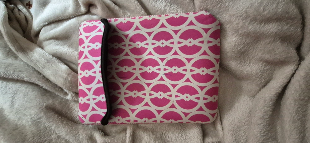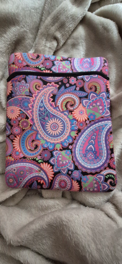 Tablet sleve one side has pink geometric pattern, other is a paisley print. Soft neoprene material. Fits most tablets. Tablet in frame not included. Has some stains.