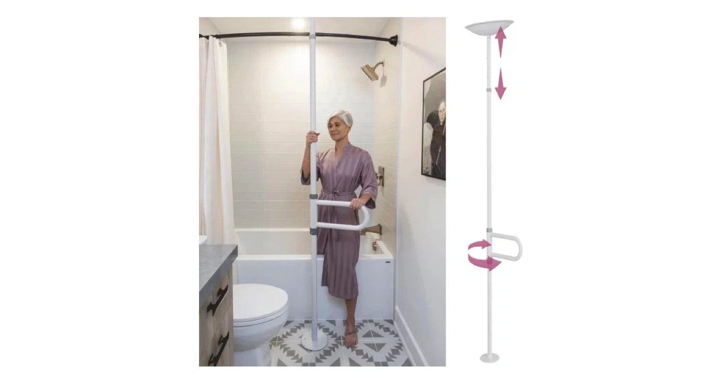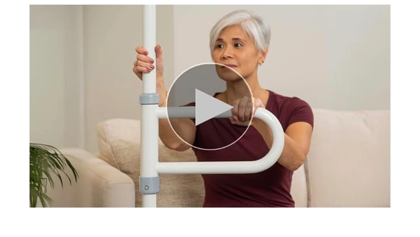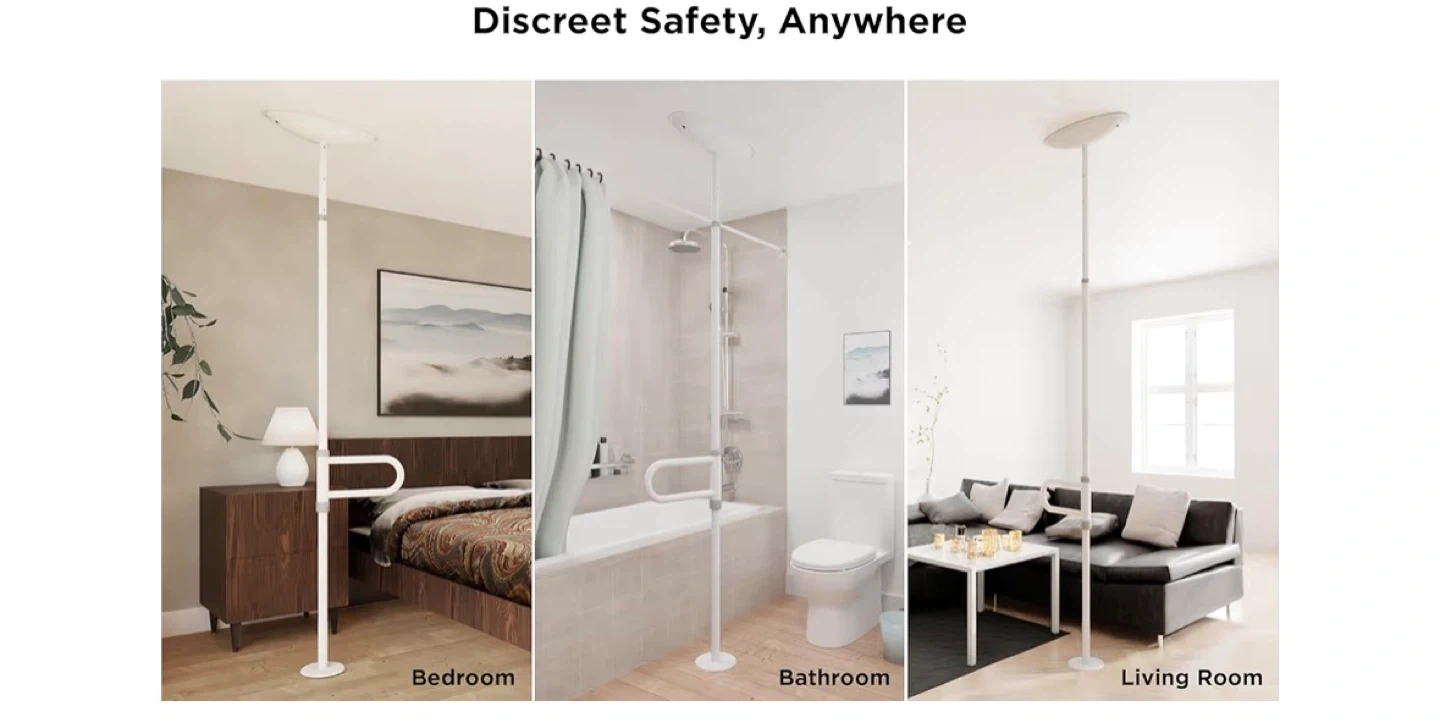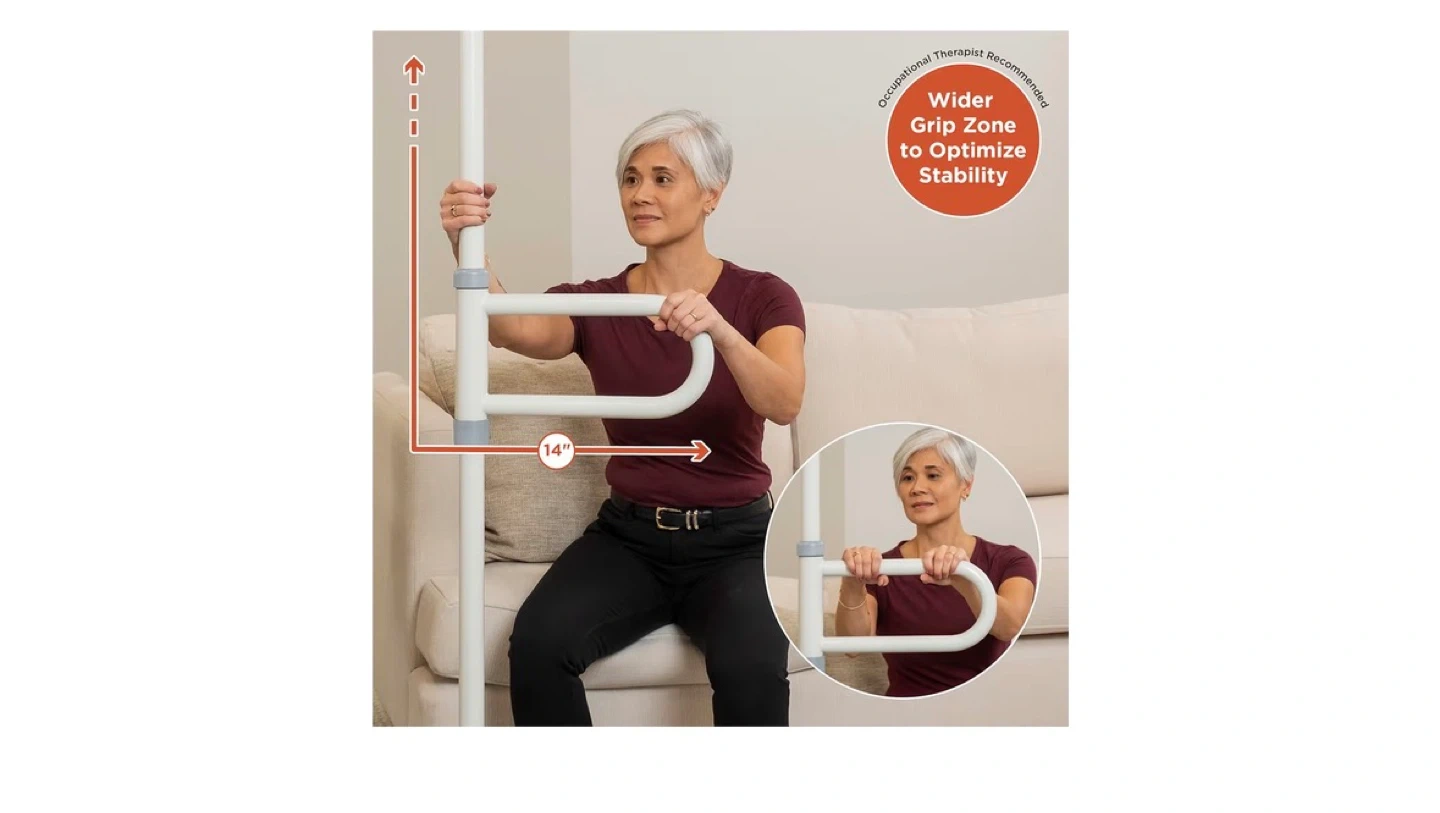 This safety pole provides discreet support for getting up and down. It features a wider grip zone to optimize stability and has 8 support positions. It's occupational therapist recommended and can be used in various rooms like the bedroom or bathroom.
