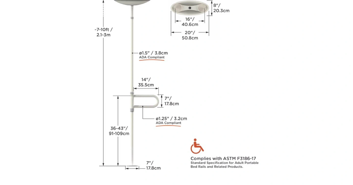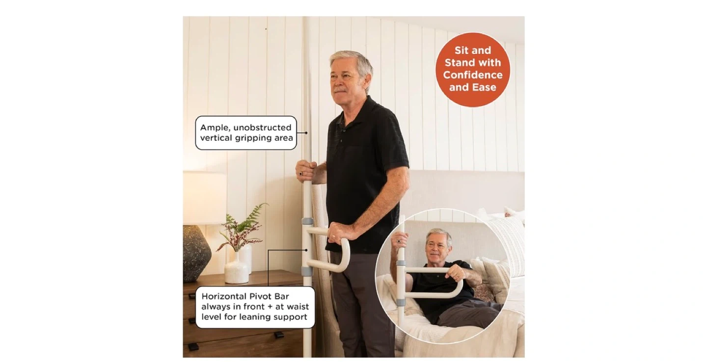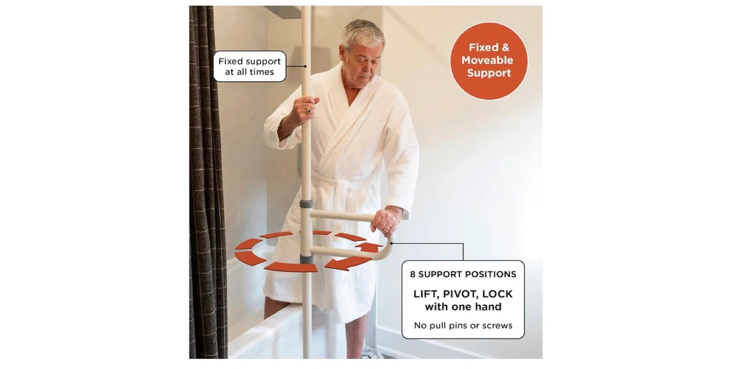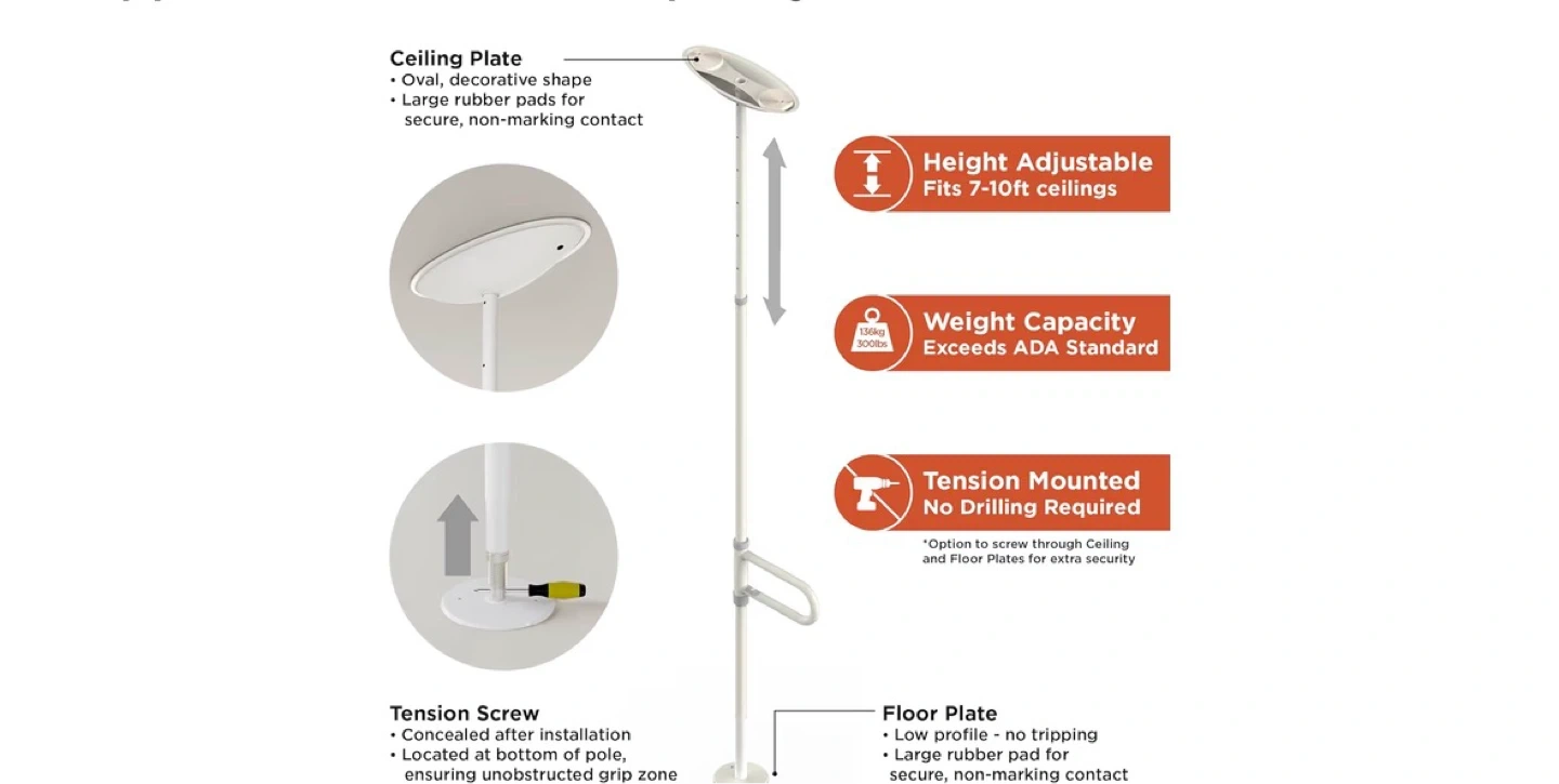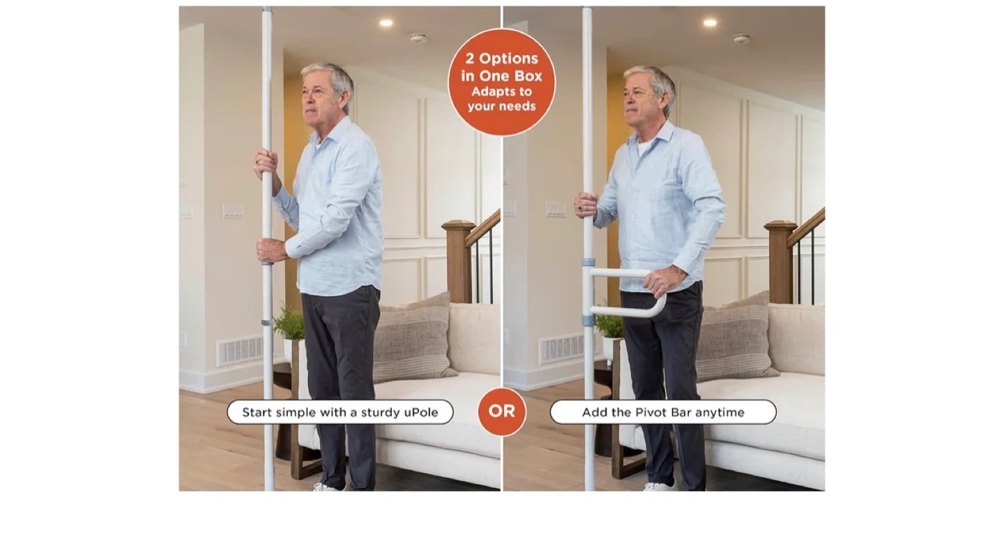 This safety pole provides discreet support for getting up and down. It features a wider grip zone to optimize stability and has 8 support positions. It's occupational therapist recommended and can be used in various rooms like the bedroom or bathroom.
