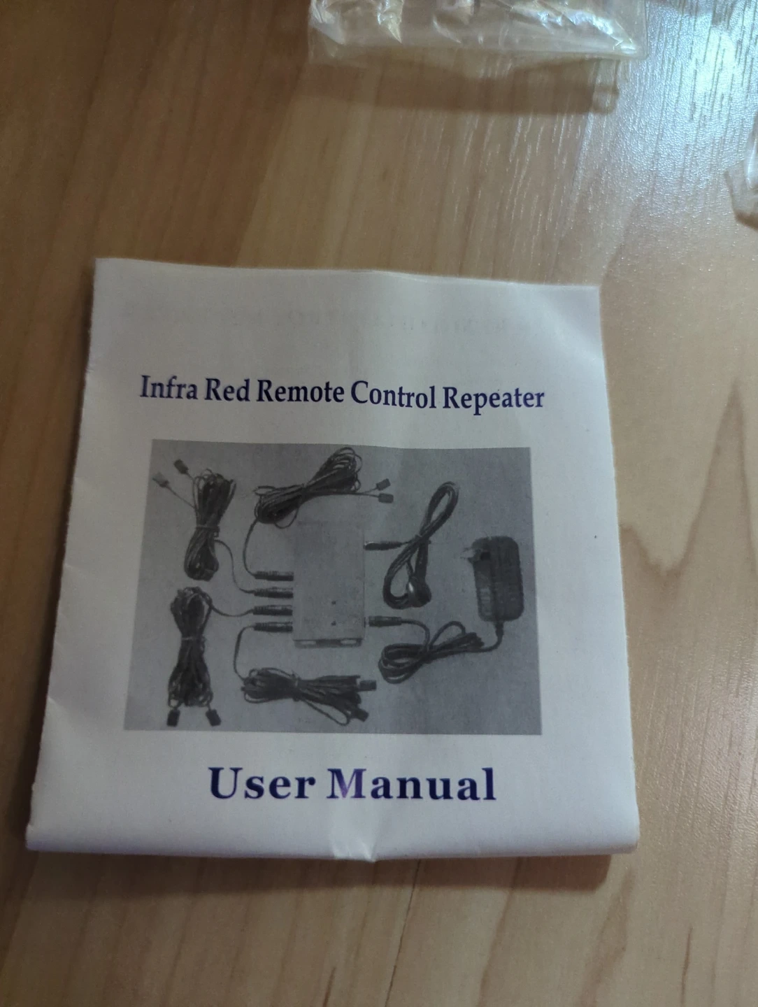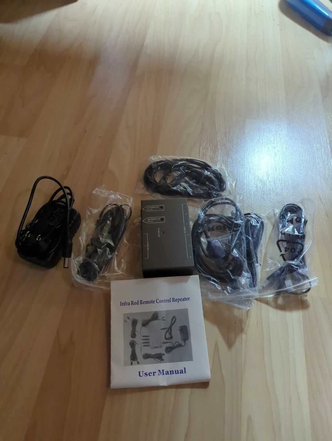 Infra Red Remote Control Repeater system. Includes the main unit, power adapter, IR receiver and emitter cables, and user manual. Great for extending your remote control's range!