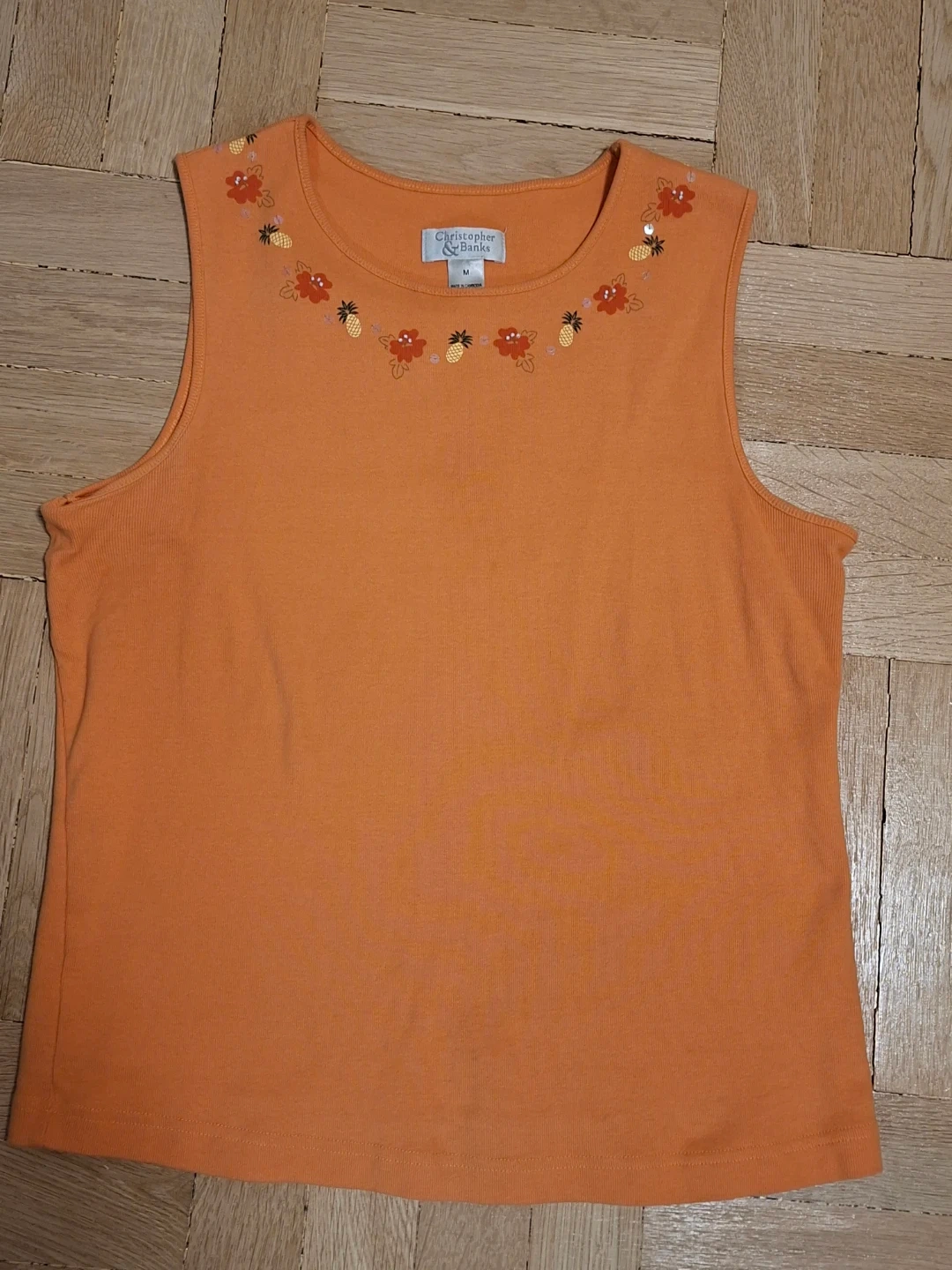 This sleeveless orange tank top from Christopher & Banks features a pretty floral and pineapple embroidered neckline with sequin accents. It's a size medium. Great for summer!