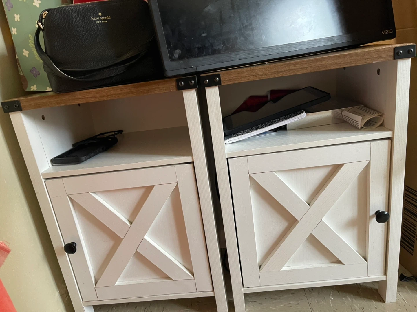 This set includes two white farmhouse-style side tables or cabinets. Each features a distinctive cross-design on the cabinet door and a black knob. living rooms.