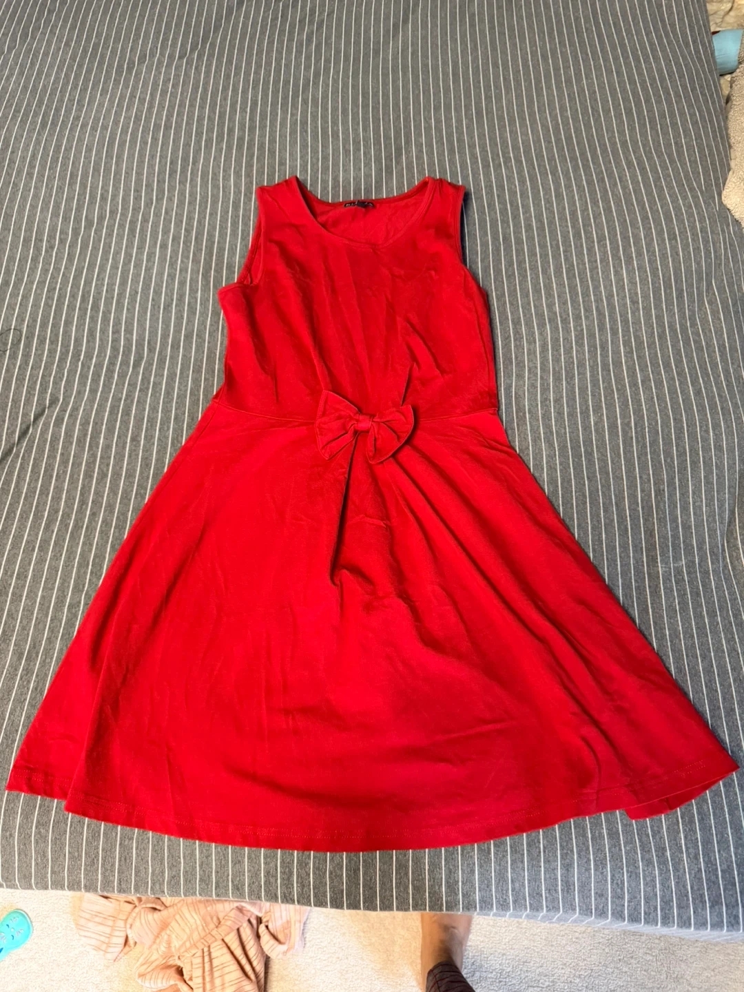 A bright red sleeveless dress. It features a cute bow detail at the waist. The dress is made of a soft, stretchy fabric.