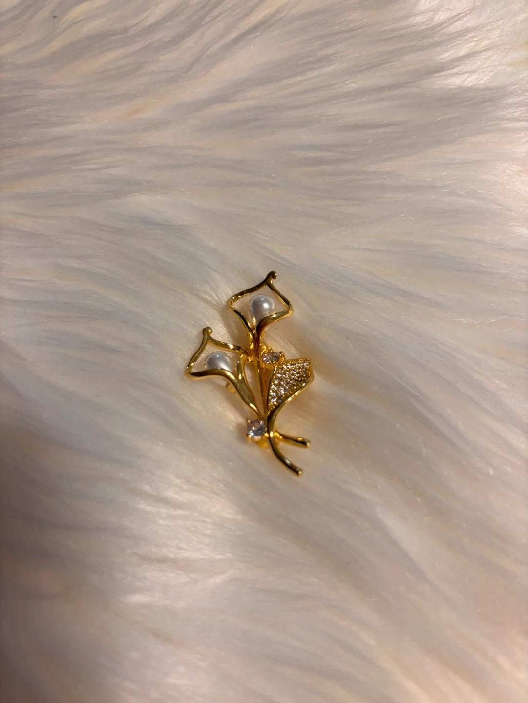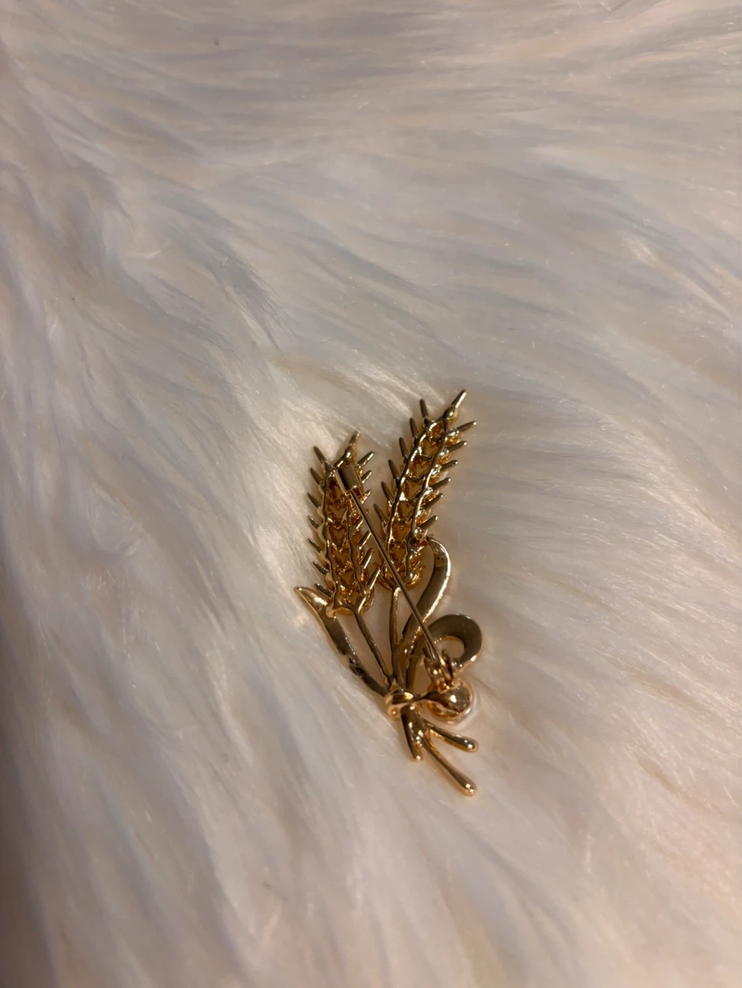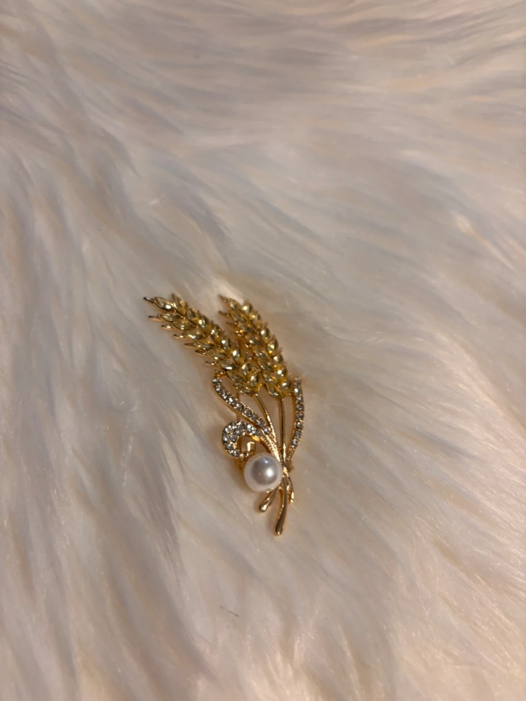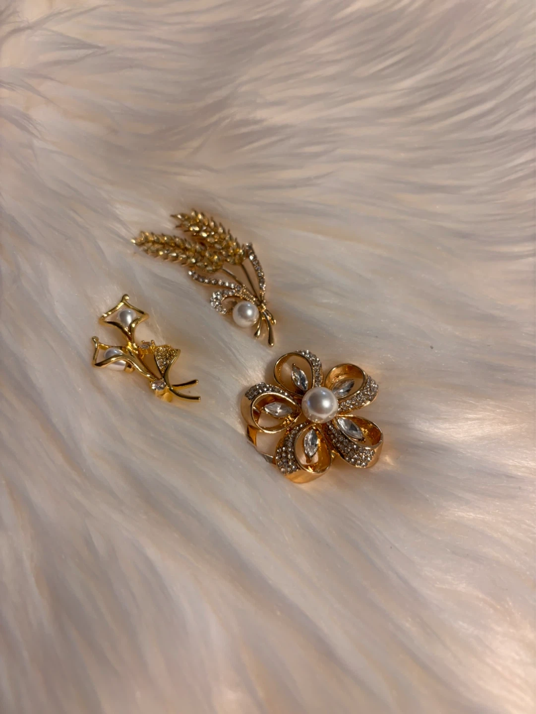 A set of three gold-tone brooches featuring faux pearl accents and sparkling rhinestones. Includes a wheat stalk design, a floral design, and a smaller abstract design. These brooches are perfect for adding a touch of elegance to any outfit!
