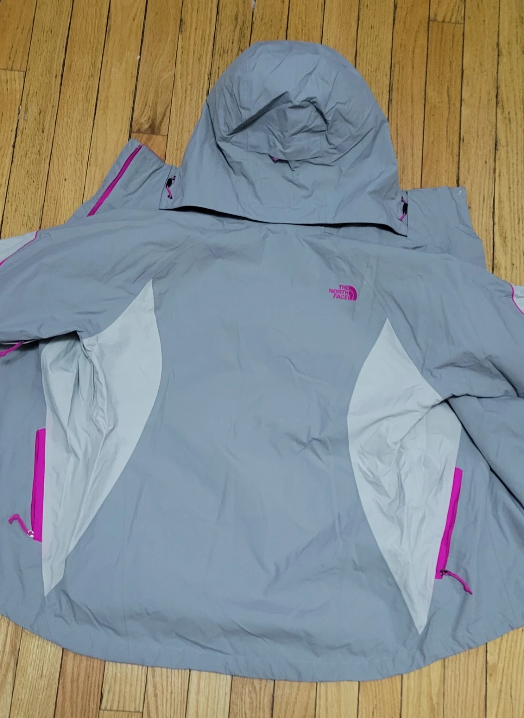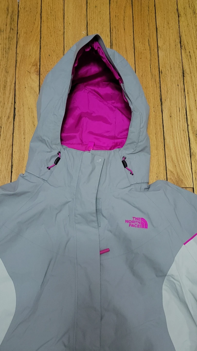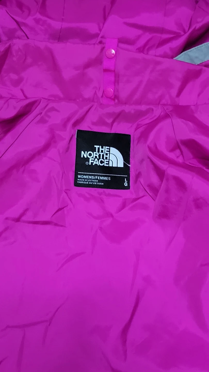 This is a women's jacket from The North Face. It's a size L with a bright pink lining. The exterior is light grey with pink accents.