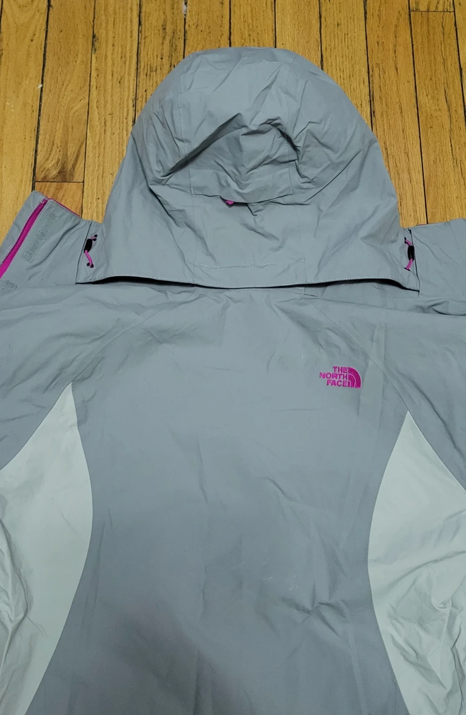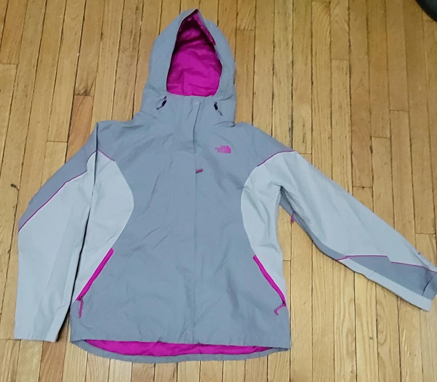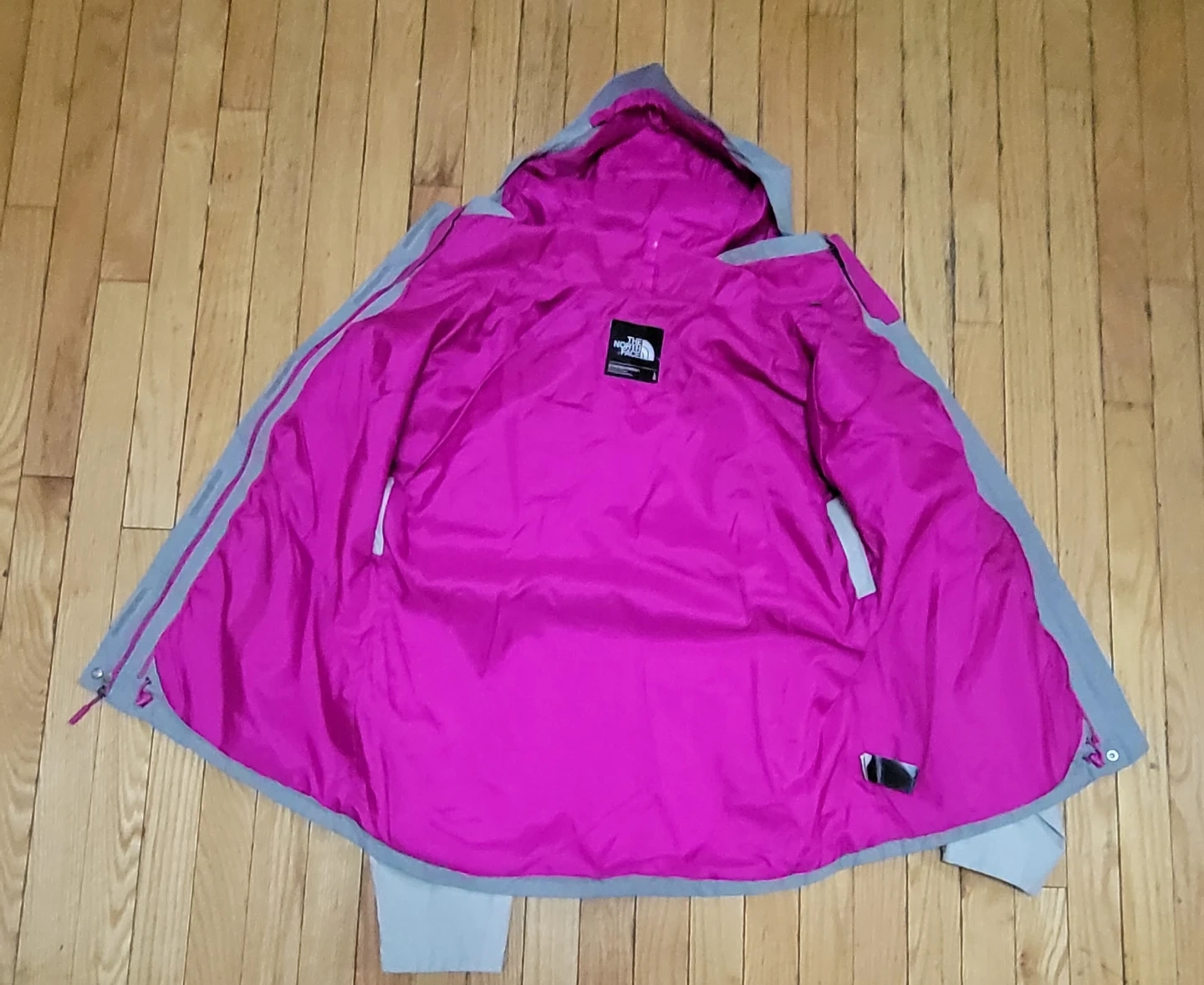 This is a women's jacket from The North Face. It's a size L with a bright pink lining. The exterior is light grey with pink accents.