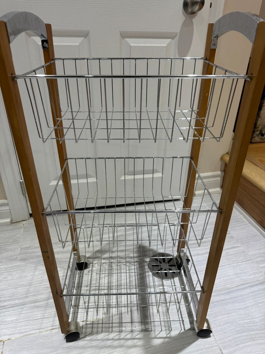 This versatile cart features three wire baskets for ample storage. It's made with a wooden frame and metal accents, and it's on wheels for easy mobility. Great for keeping produce handy in the kitchen or pantry!