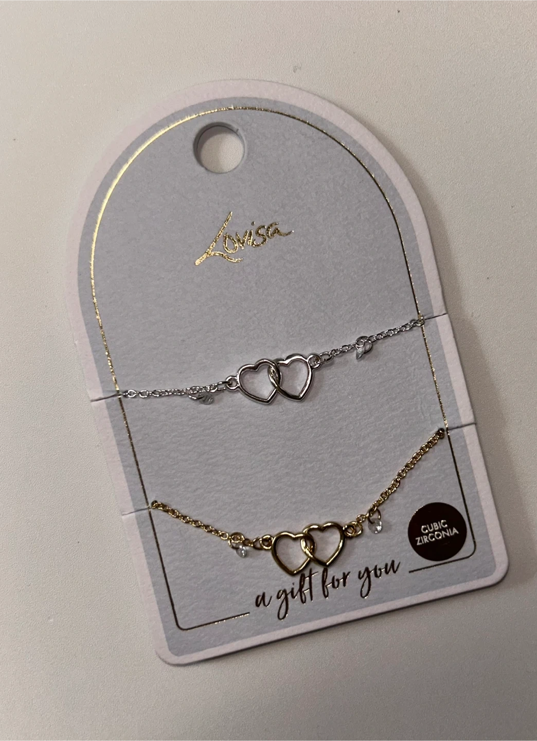 Set of two delicate bracelets from Lovisa, featuring interlocking heart charms. One bracelet is silver-toned and the other is gold-toned, both accented with cubic zirconia. It's a thoughtful gift set for someone special!