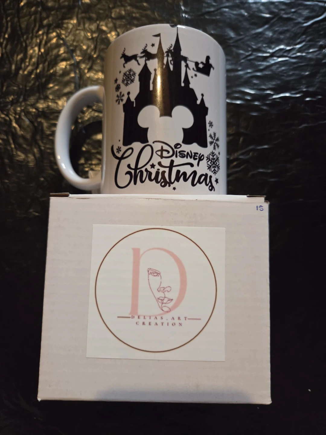 This white ceramic mug features a black silhouette design of Cinderella Castle with Mickey Mouse ears, Santa's sleigh, and snowflakes. It says "Disney Christmas" in a festive script. It's a great mug for enjoying your favourite holiday drinks! It comes with a box from Delta's Art Creation.