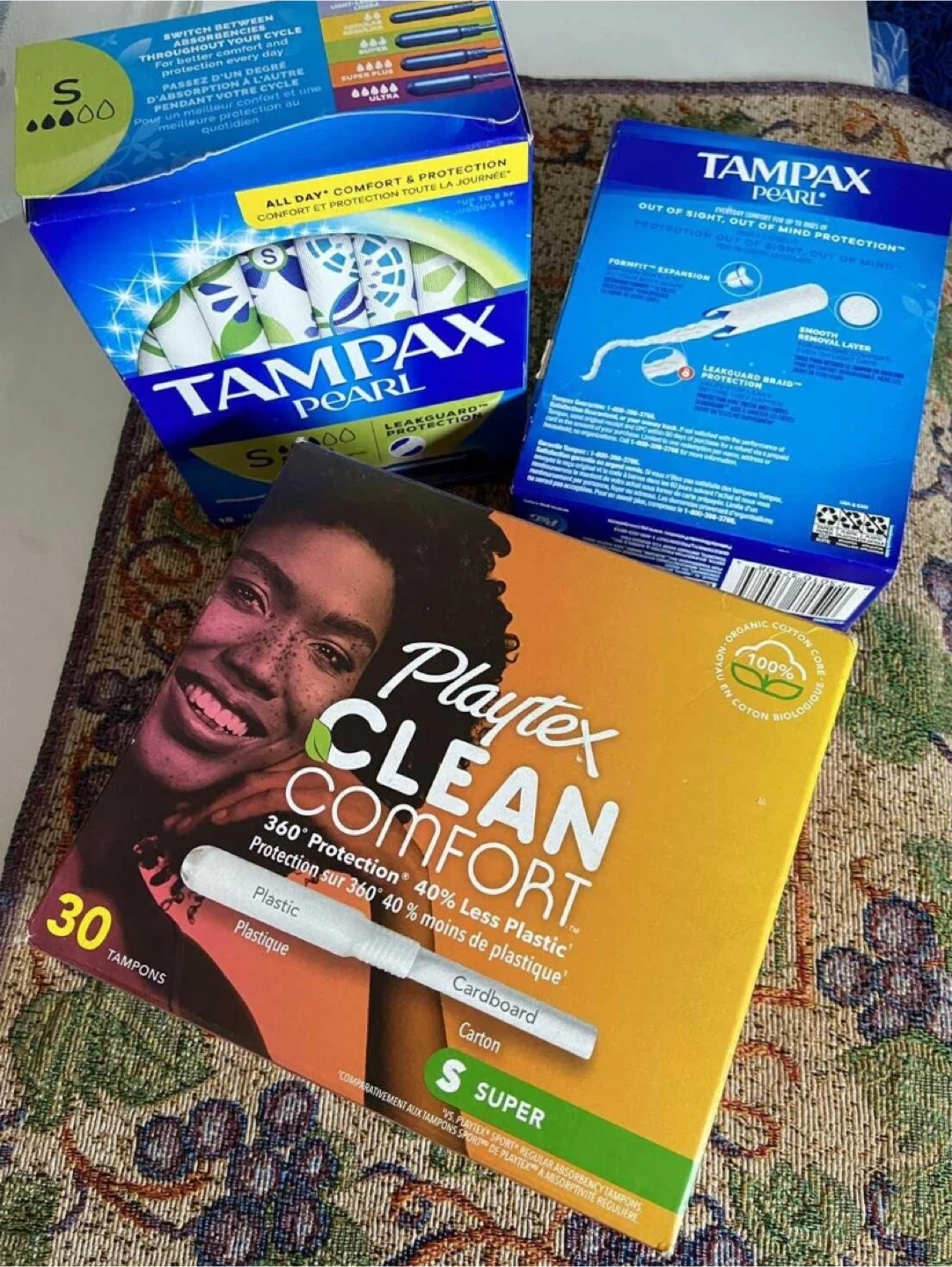 Three boxes of Tampax Pearl tampons are available. One box is Playtex Clean Comfort, containing 30 Super size tampons with 360° protection and 40% less plastic. Two boxes are Tampax Pearl, offering all-day comfort and protection. These tampons are for menstrual use.