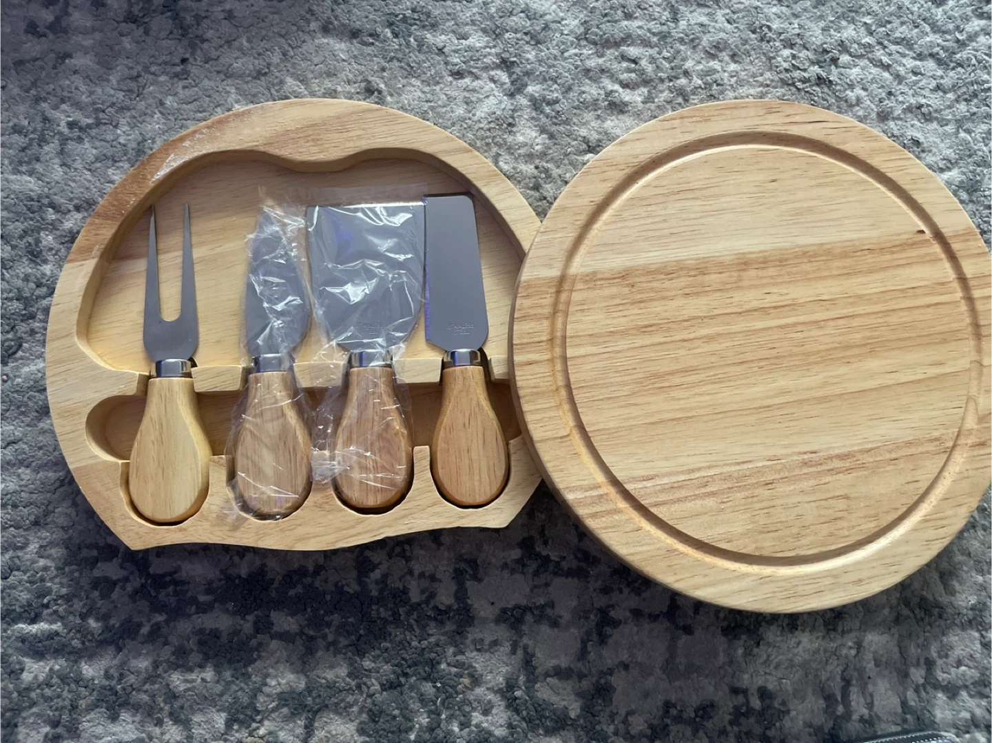 Selling a wooden cheese board and knife set! The set includes a round wooden cheese board and three cheese knives/utensils with wooden handles. The board is about 8 inches in diameter. It's brand new and ready for your next gathering!
