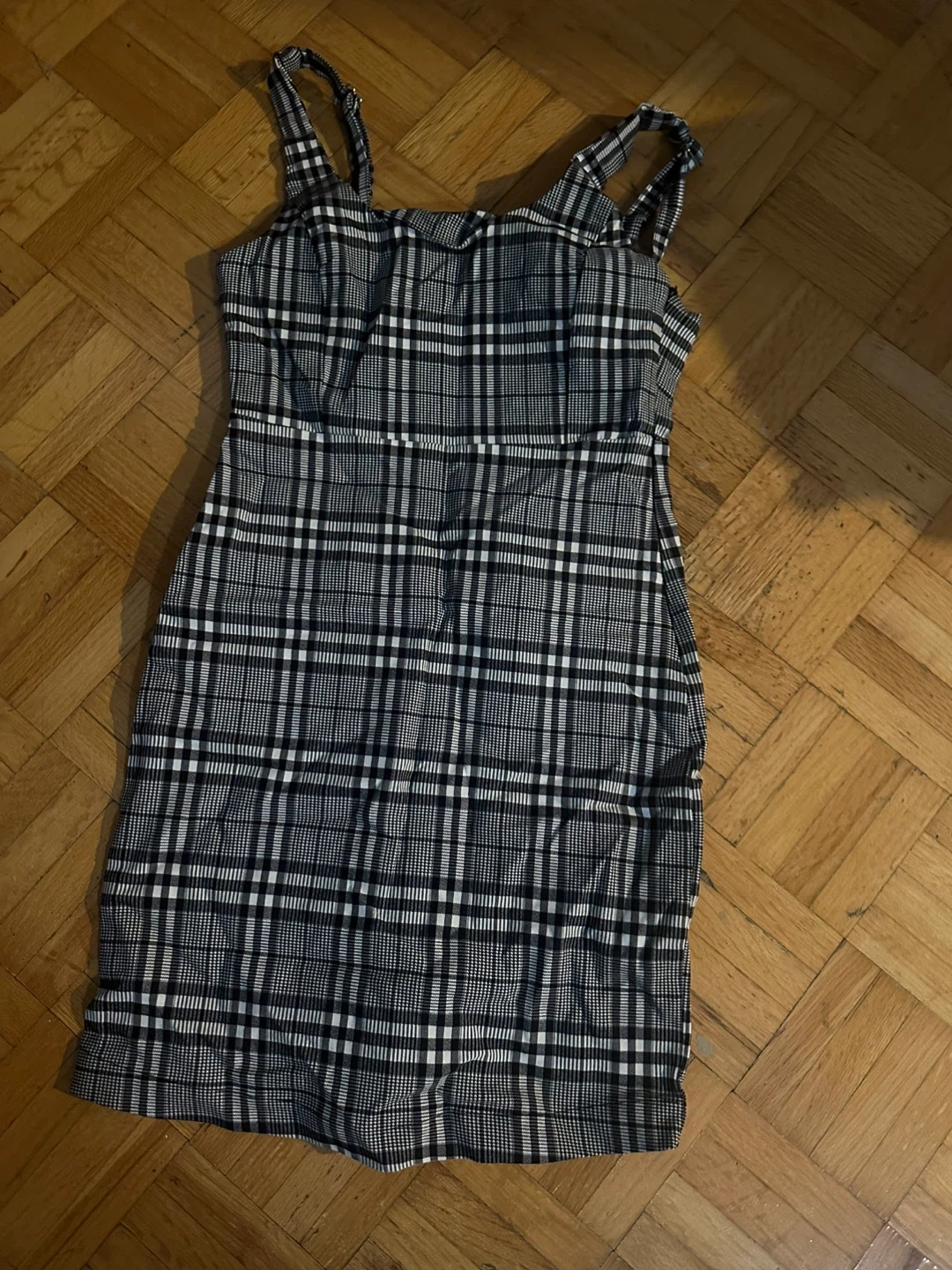 A collection of four dresses featuring various styles. Includes a pink floral print dress, a yellow crinkled maxi skirt-style dress, a grey polo dress, and a black and white plaid mini dress. Also a navy and white striped t-shirt dress with "Hilfiger" embroidery. Mostly size medium. Material is soft cotton blend. Perfect for casual wear!