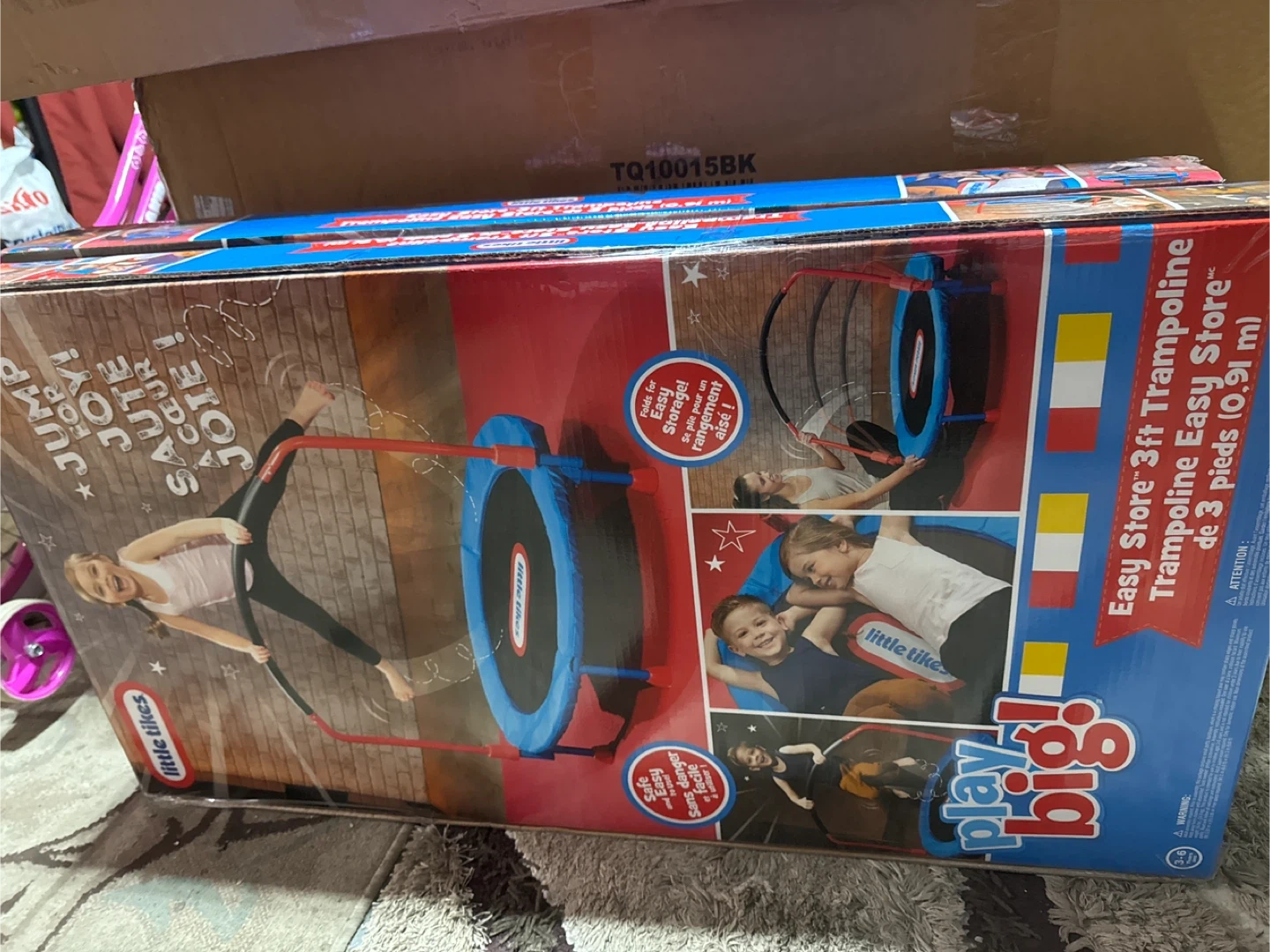 Little Tikes Easy Store 3ft Trampoline for kids. It folds for easy storage and is made for indoor/outdoor play. Suitable for ages 3-6.