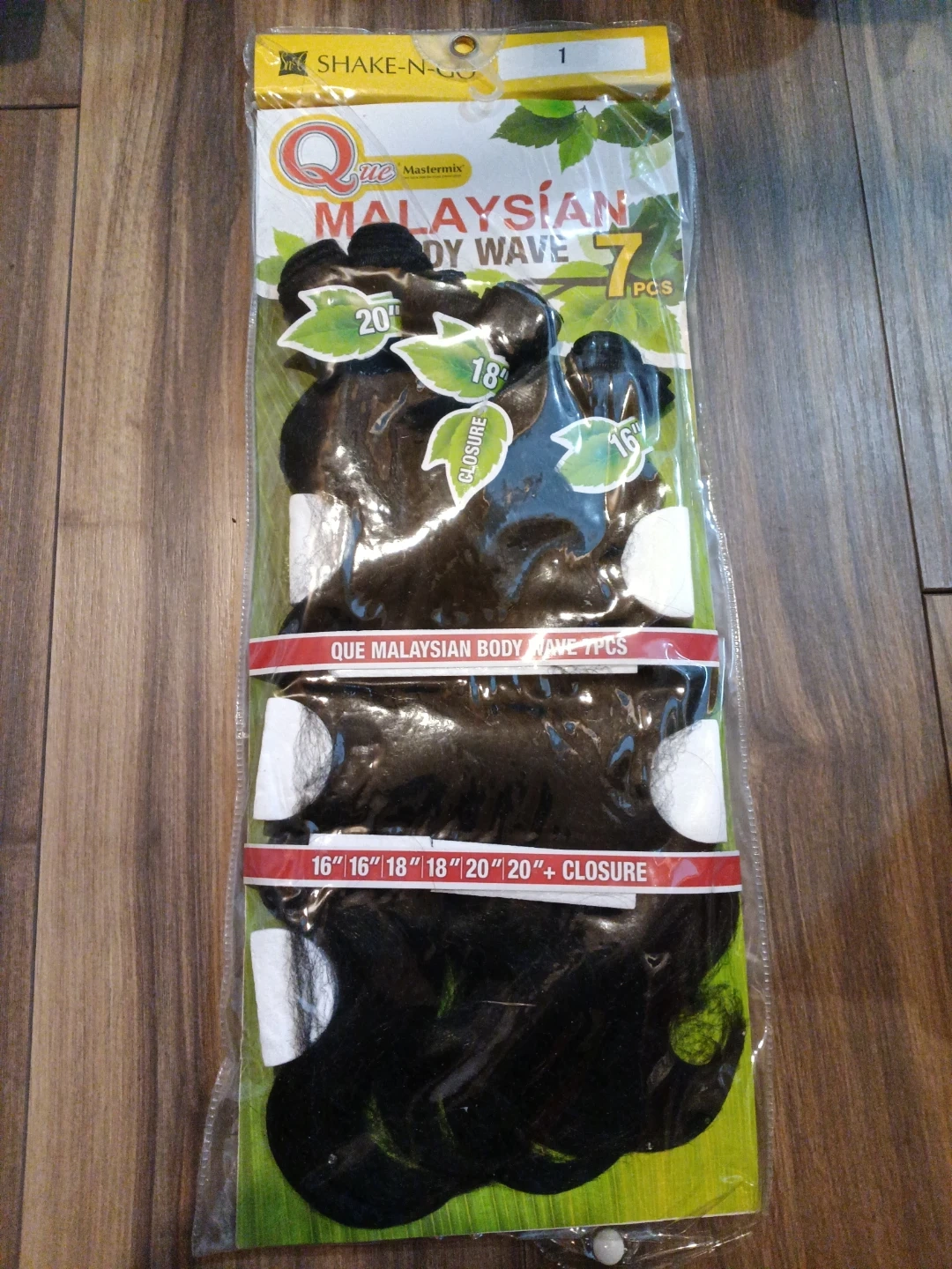 This is a Shake-N-Go Que Mastermix Malaysian Body Wave hair set. It includes 7 pieces total: two 16", two 18", two 20", and one closure. The lengths are 16", 16", 18", 18", 20", and 20" plus a closure piece. 🥕