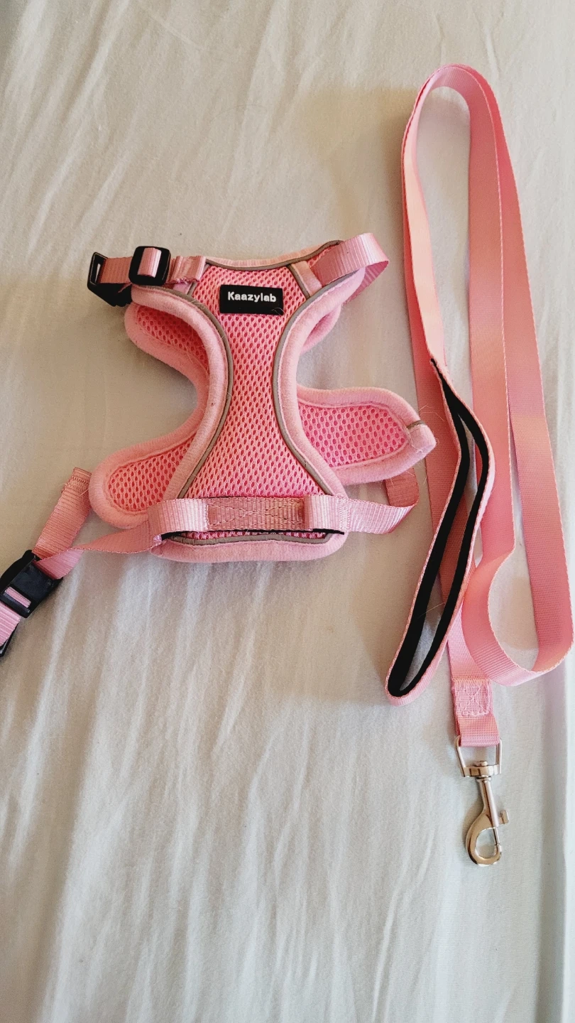 This is a pink mesh dog harness and leash set from Kaazylab. It features adjustable straps for a comfortable fit. The set includes a harness and a matching leash.