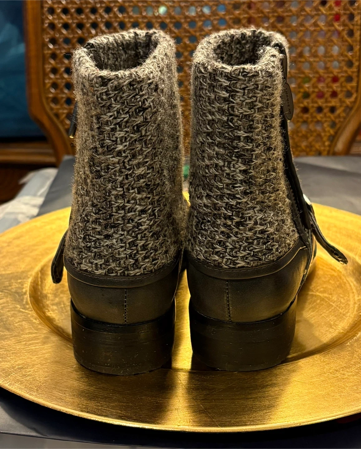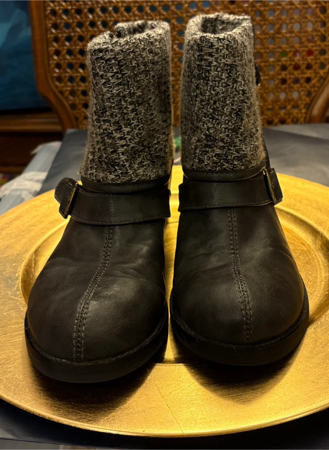 Selling a pair of Dr. Scholls ankle boots! They're a stylish mix of gray knit and leather. They feature a zip closure and buckle detail. Great for adding a bit of edge to your outfit!