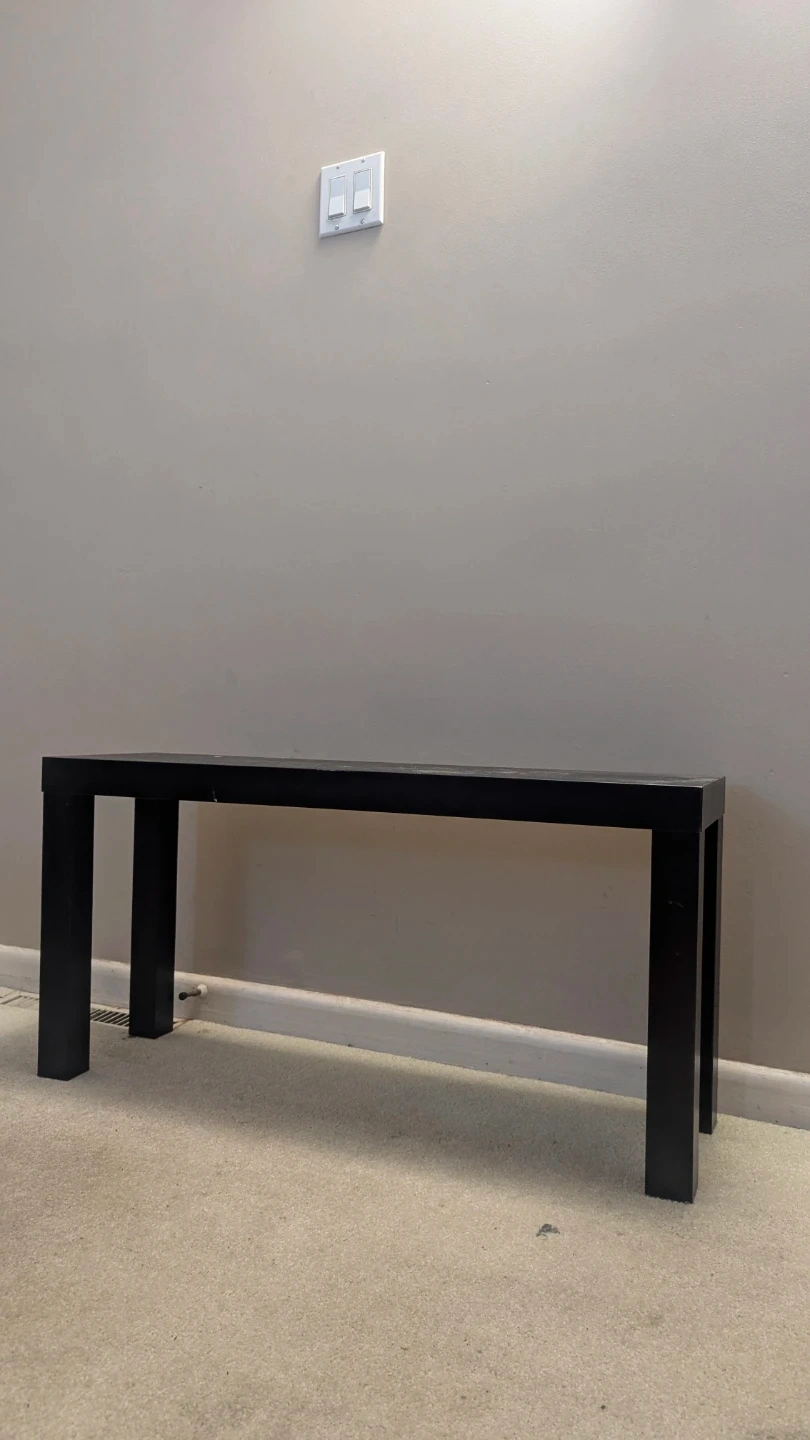A simple black console table with four sturdy legs. It's made of a durable material, perfect for entryways or hallways. This table's clean design complements most decor styles.