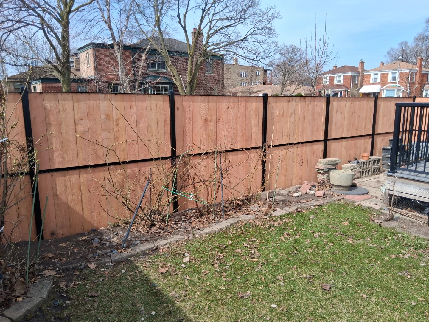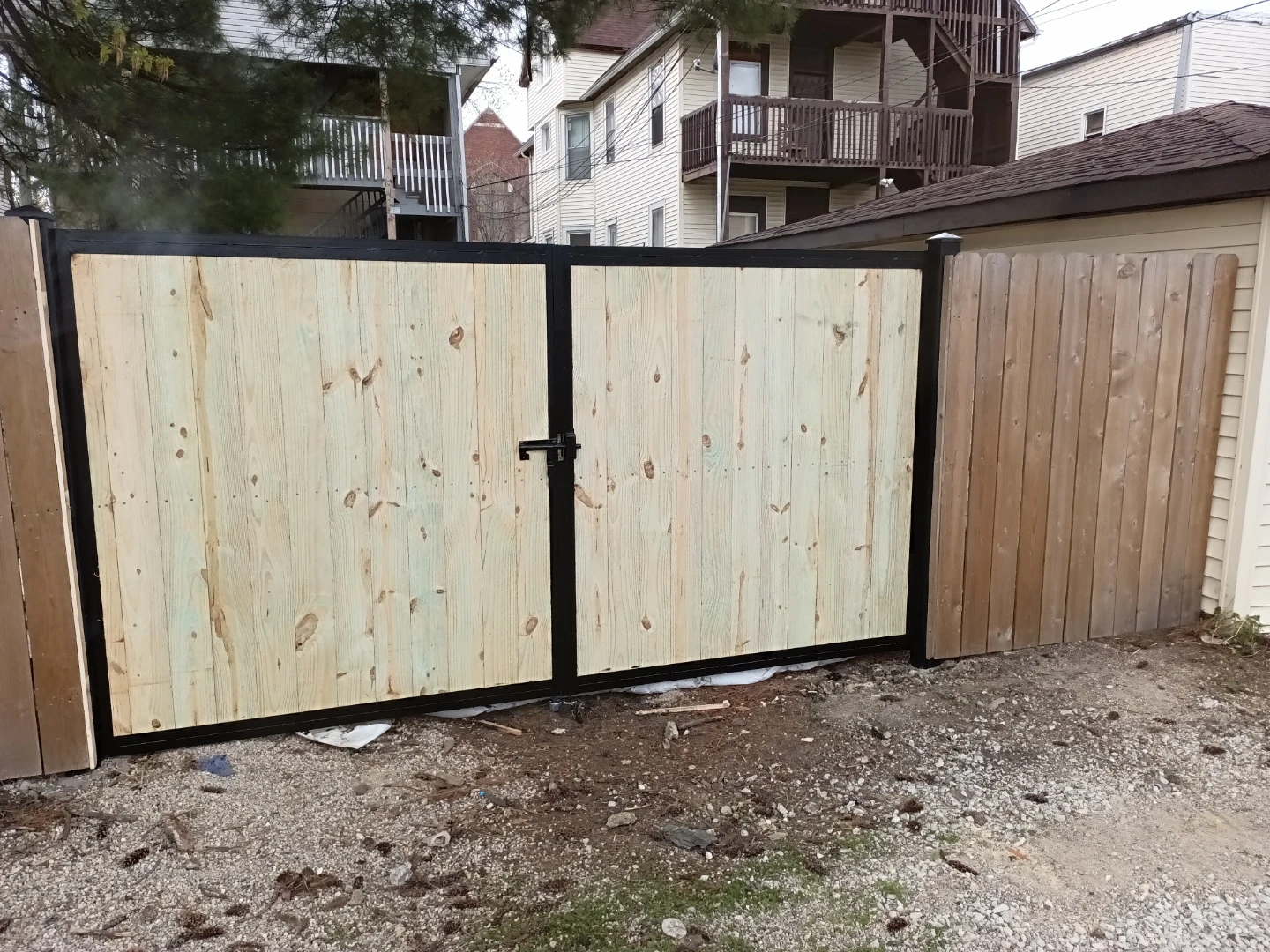 This gate features a sturdy black metal frame with natural wood paneling. It includes a latch for secure closure. Perfect for securing your driveway or backyard entrance!