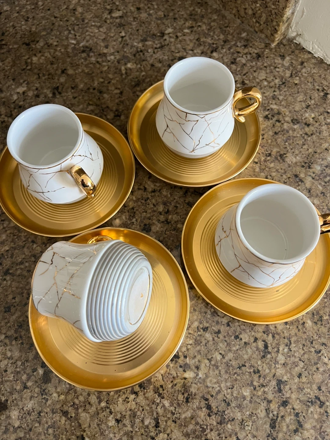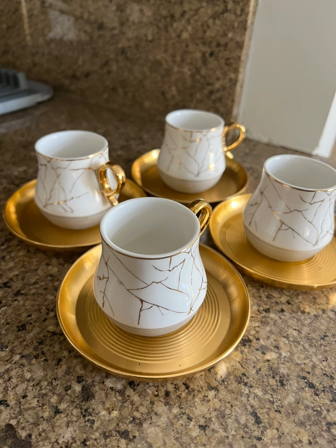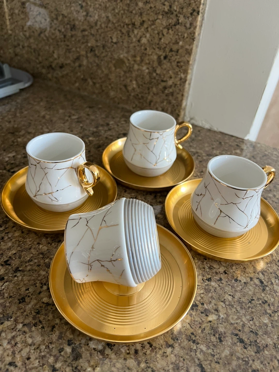 This set includes four white coffee cups with a gold marble-like pattern and matching gold saucers. The cups have distinctive gold handles. They're perfect for serving espresso or Turkish coffee.