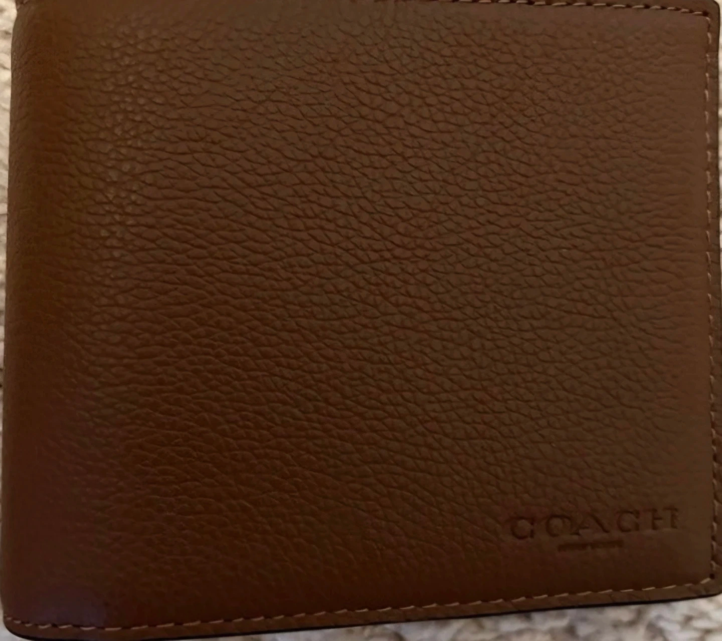 This is a brown leather bifold wallet from Coach. It has multiple card slots and a bill compartment. It's a classic wallet for everyday use.