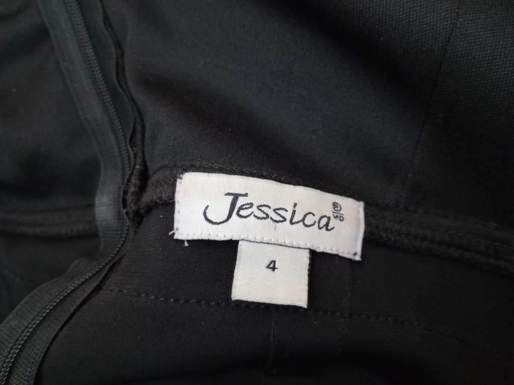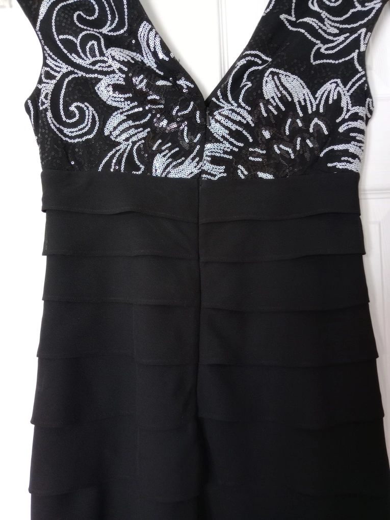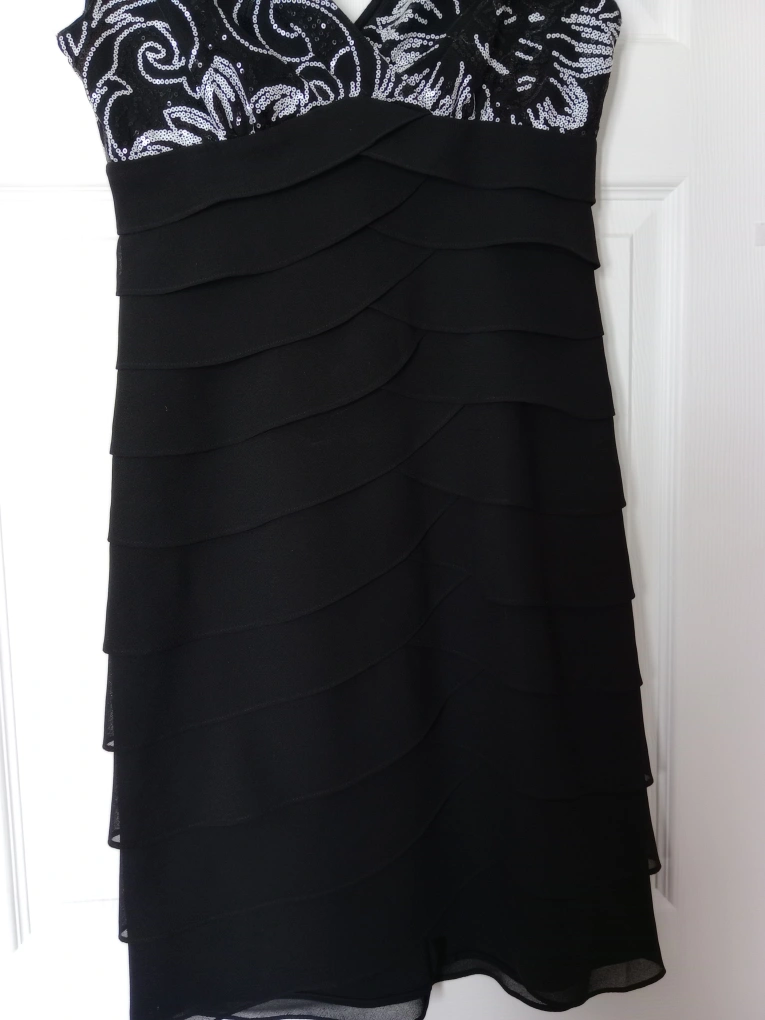Black sleeveless cocktail dress. Size 4. Features a V-neck and layered skirt. Silver sequin detailing on bodice. Elegant and stylish.