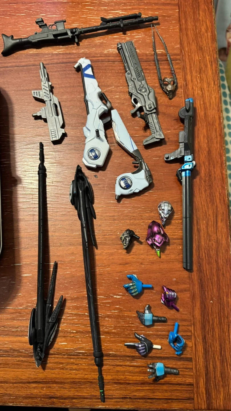 This lot includes a variety of action figure weapons and accessories, such as rifles, pistols, swords, some heads and interchangeable hands. Many pieces are from Neon Genesis Evangelion EVA figures or Todd McFarlane figures. Comes in a tin storage case.