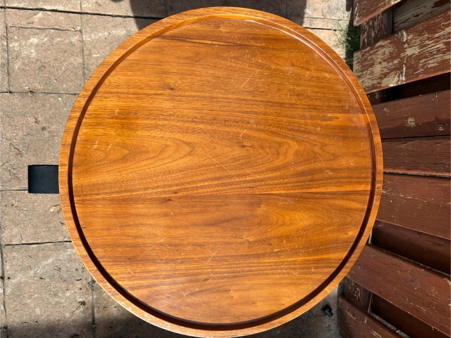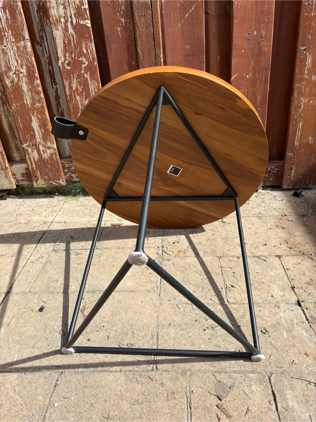 Round wooden side table with a dark metal triangular frame. This table has a warm wood finish and a raised edge. It's a sturdy accent piece for any room. Very minor wear. See pics. 21”W x 19.5”H