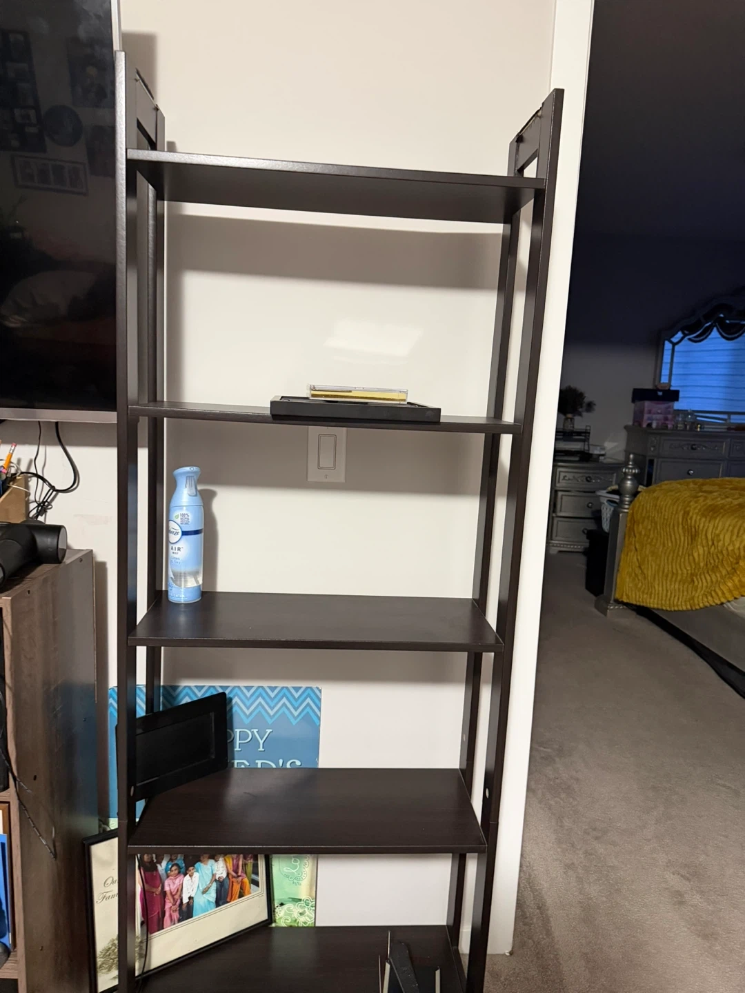 This is a dark brown ladder shelf with four shelves. It's a sturdy piece of furniture. It would be useful for storing books or displaying decor.