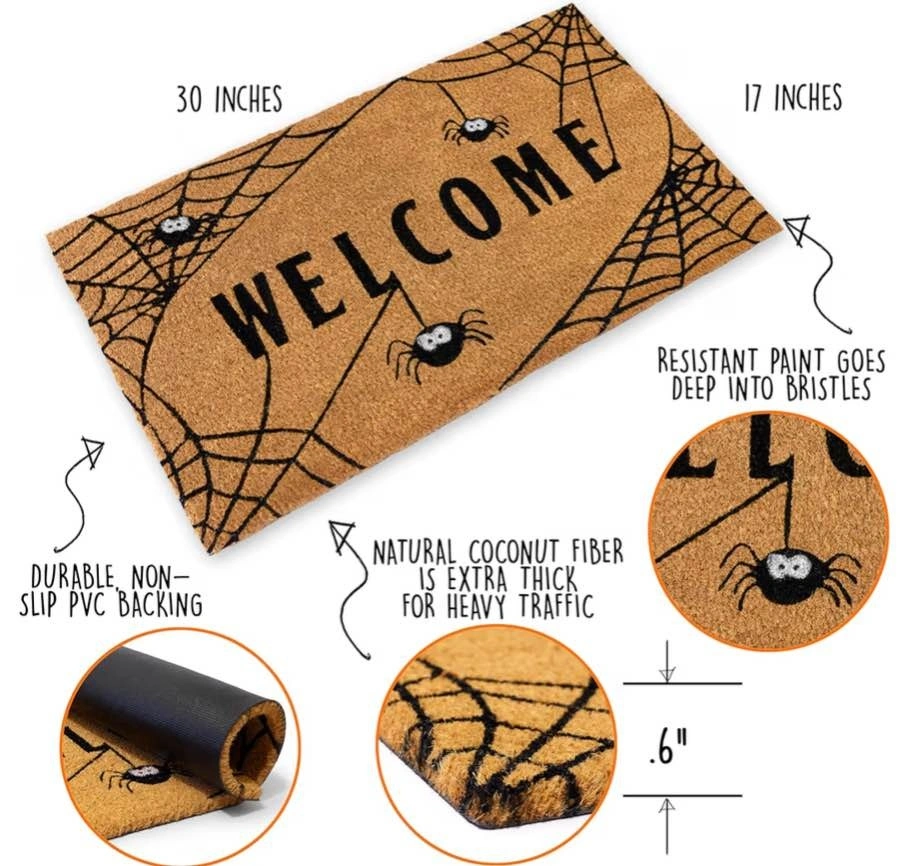 Trap dirt easily with this spiderweb doormat to add personality to your doorstep. Great for covered patios and porches, built tough with 0.6 inch thick fibers for high-traffic spots. This welcome mat shines longest in covered outdoor spaces protected from heavy rain and moisture. Made with high-quality and safe materials, this doormat steps up your welcome game. Let me know if you're interested!