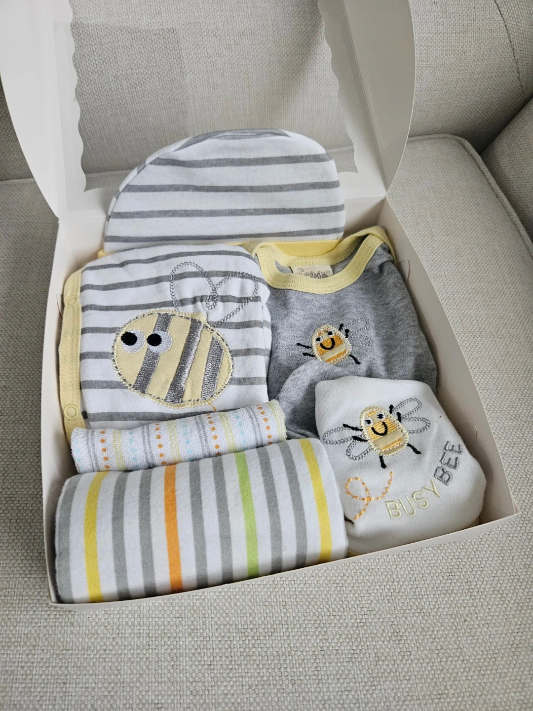 This cute baby gift set comes with a bodysuit, sleeper, hat, bib, mittens, washcloth and a receiving blanket. All pieces feature adorable bee embroidery and soft stripes. Perfect for a new arrival!