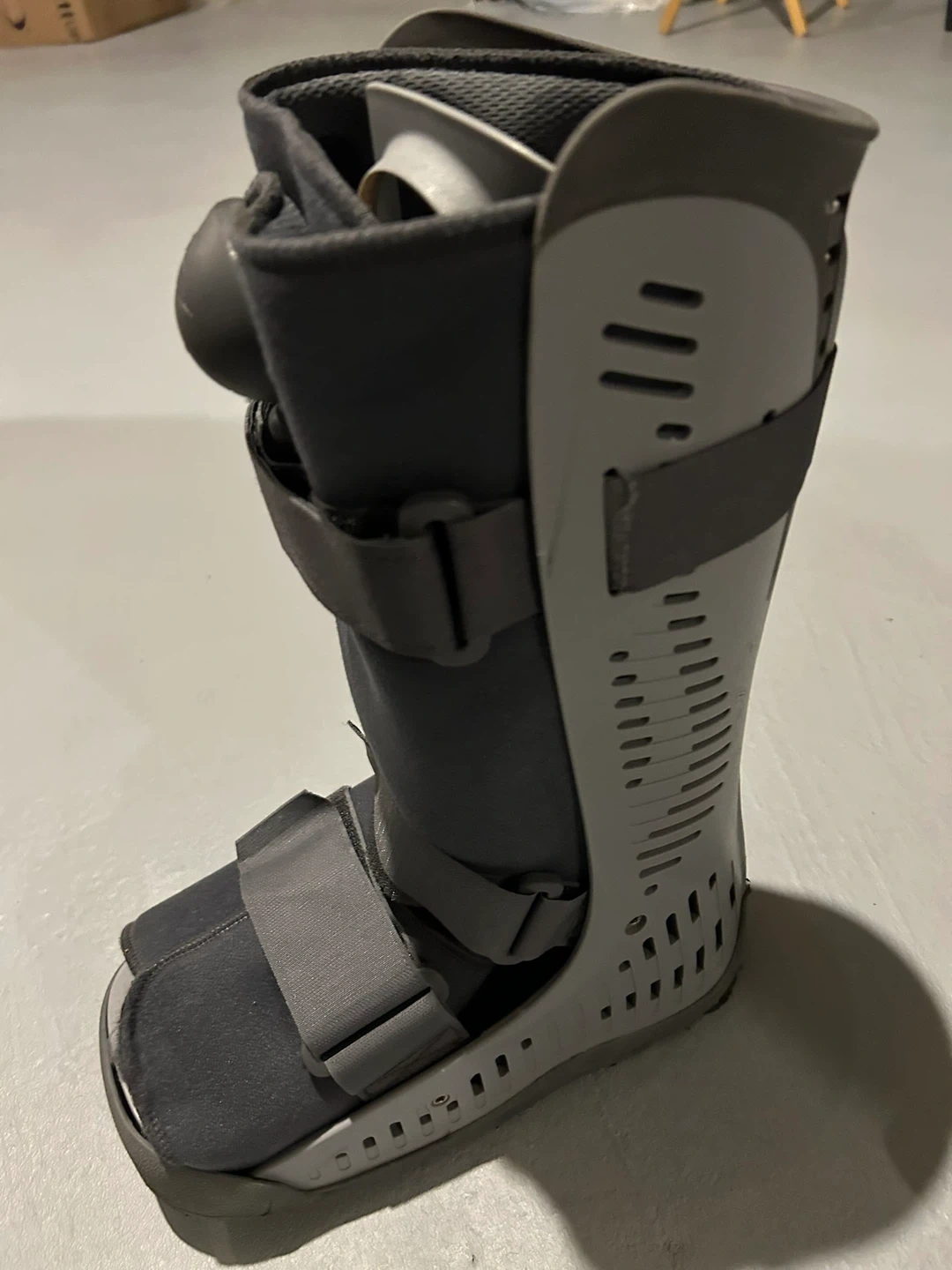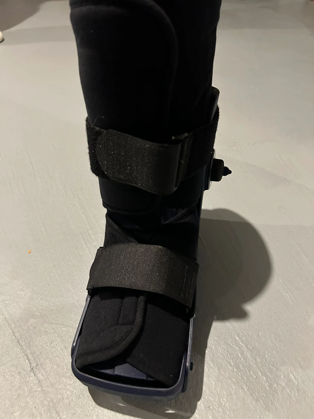 This is a walking boot designed for ankle and foot support. It features adjustable straps for a secure fit. Provides immobilization for recovery.