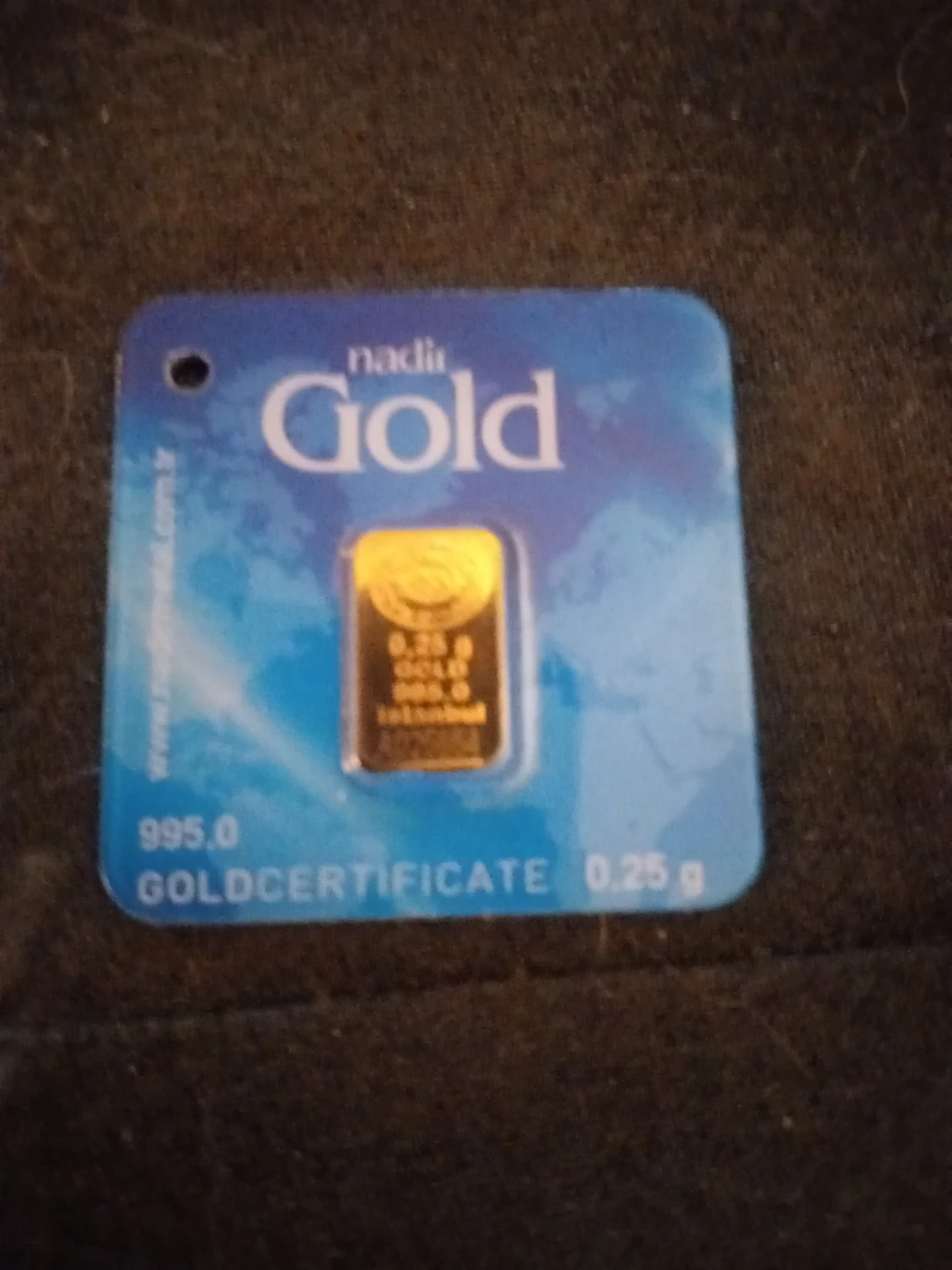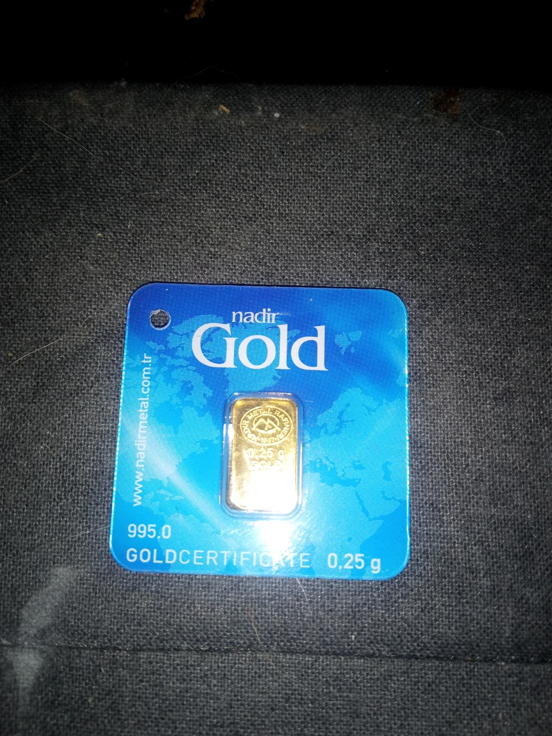Nadir Goldcertificate bar weighing 0.25 grams. It's made of 995.0 fineness gold. Comes sealed in its original packaging. Great investment and even better starting price for a long term collector .
