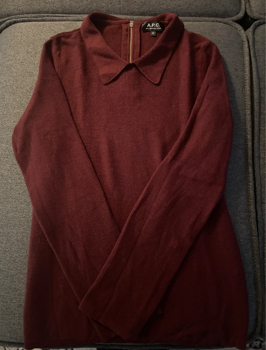 A.P.C. burgundy knit sweater with a collared neckline and a zip closure. Size medium. It's made from a soft material.