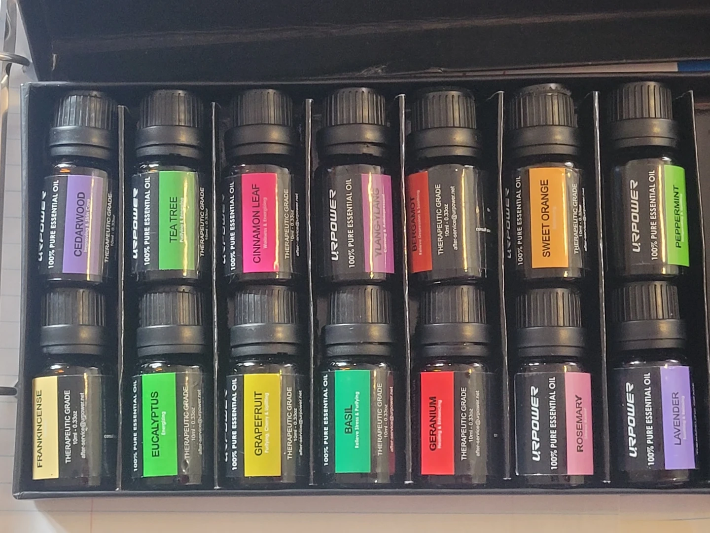 This set includes 16 bottles of 100% pure essential oils. Each bottle is 0.33oz and certified therapeutic grade. The oils are Frankincense, Eucalyptus, Grapefruit, Basil, Cedarwood, Tea Tree, Cinnamon Leaf, Geranium, Ylang-Ylang, Sweet Orange, Rosemary, Lavender, Peppermint, Lemon, Clary Sage, and Bergamot.
