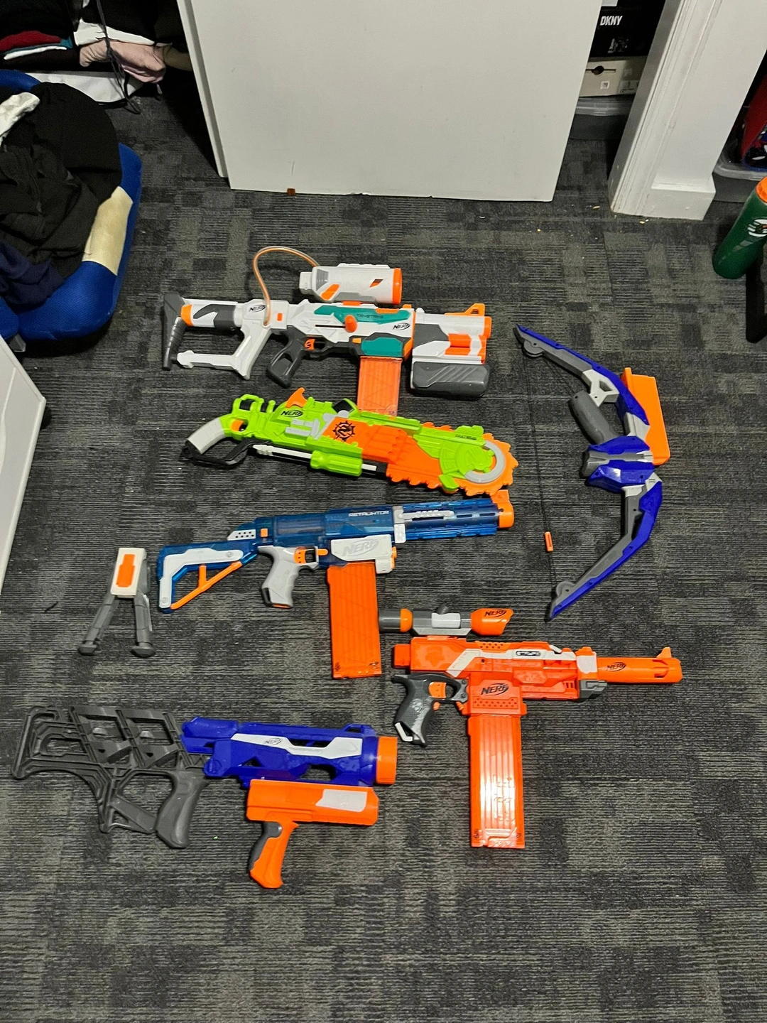 Includes: one Elite Retaliator, one Thunderblast, one Tri-Strike, one Brainsaw, one Elite Stryfe with attachments, and one Stratobow. All are Nerf brand.