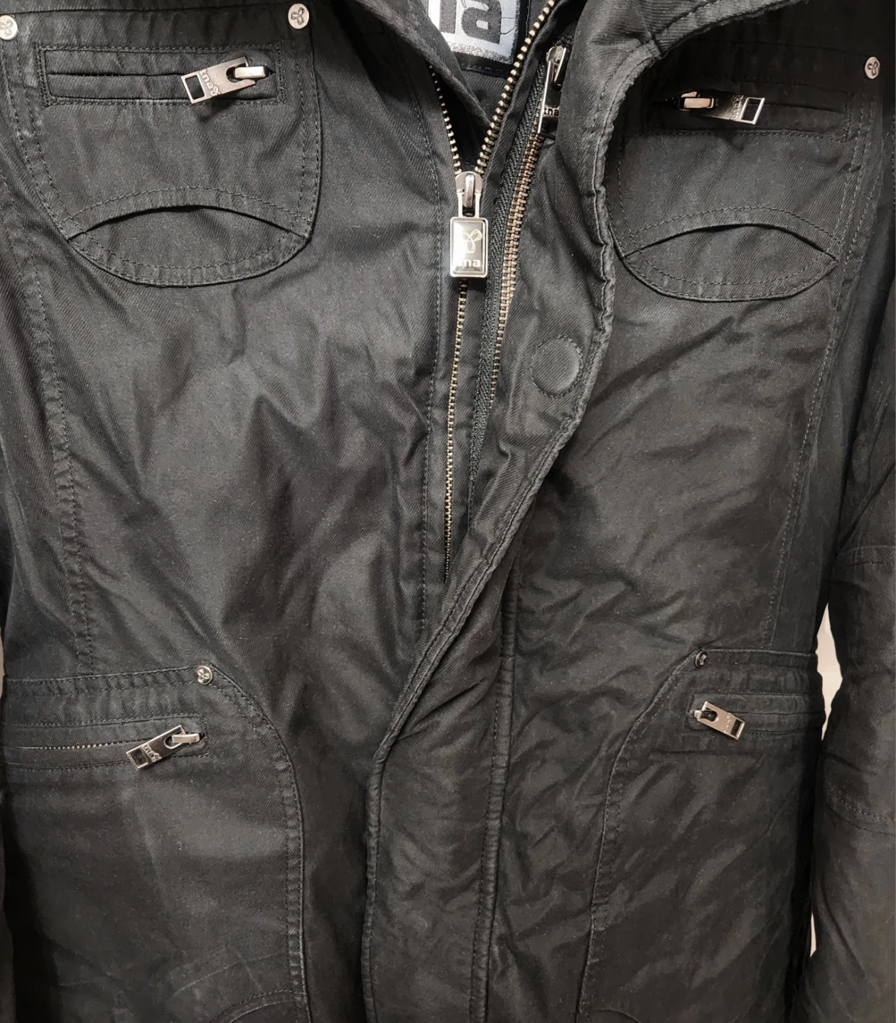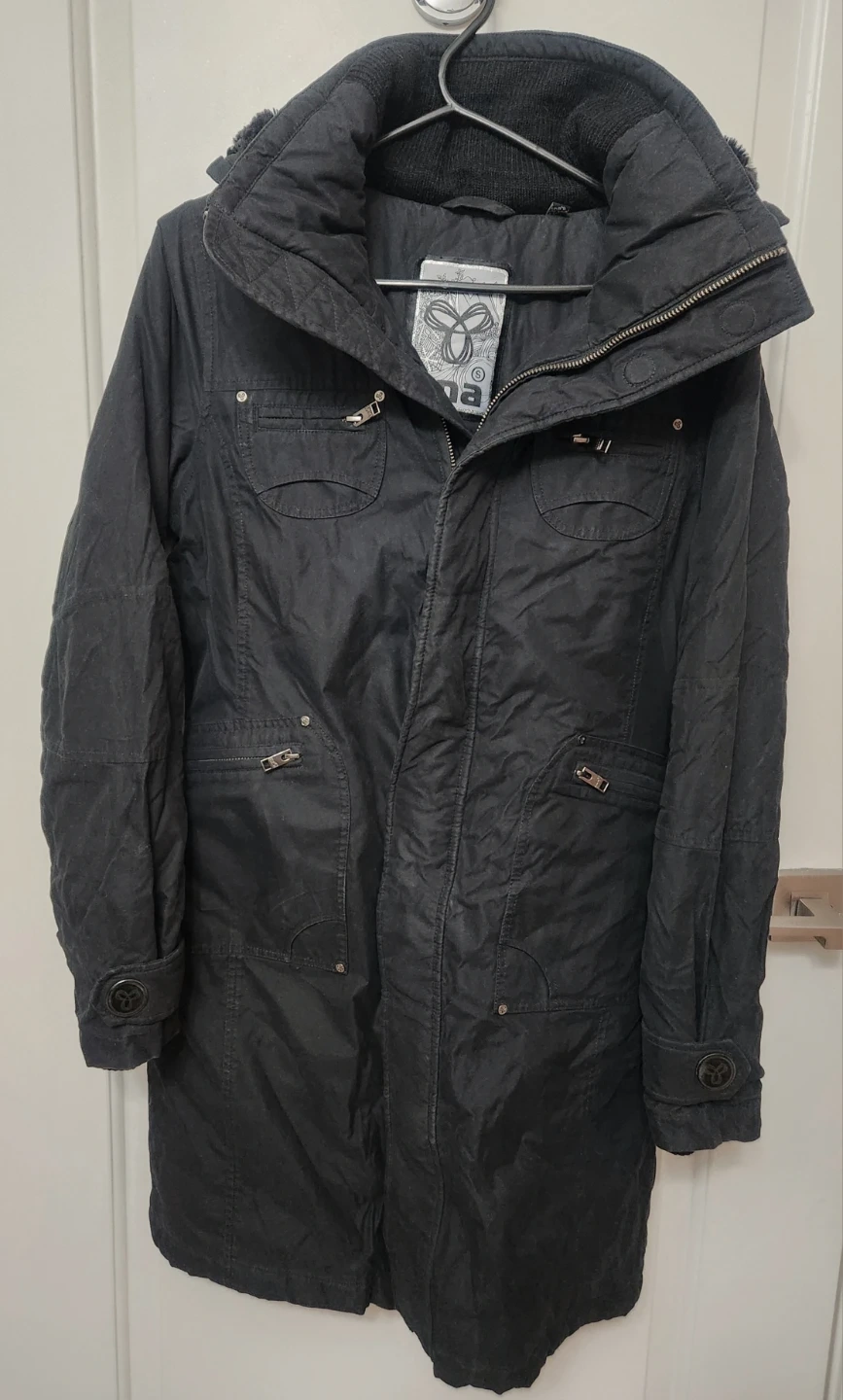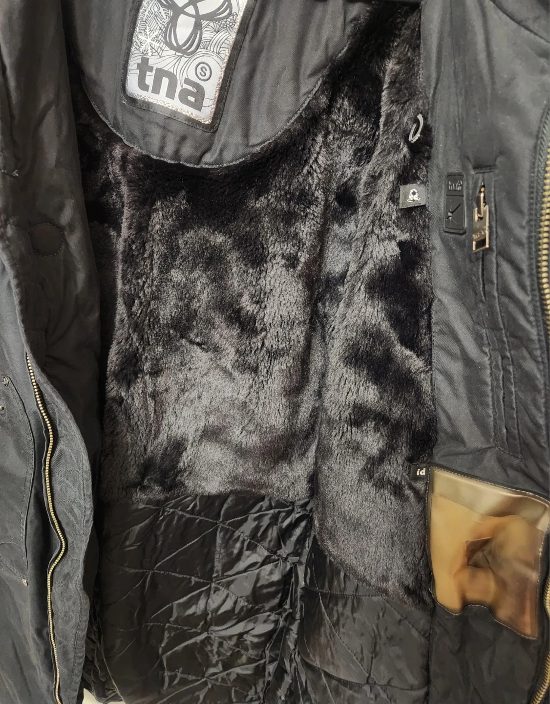 This TNA parka is black and features a cozy fur-lined hood. It's designed for warmth with multiple pockets. It's perfect for cold Canadian winters!