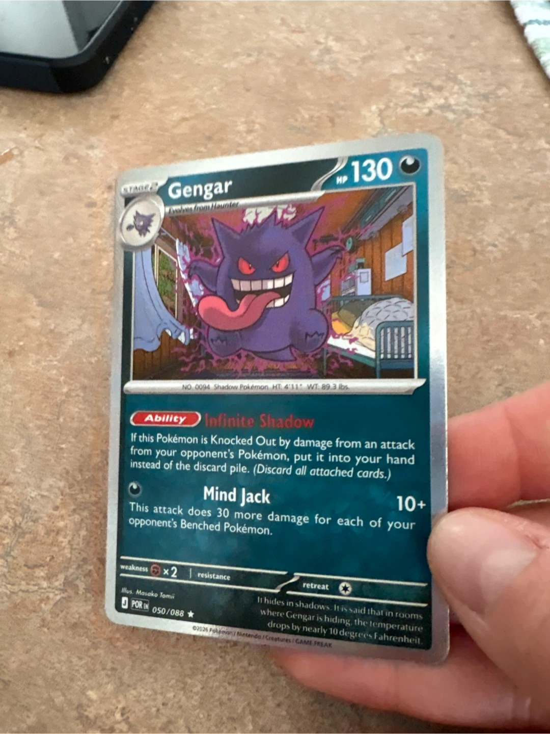 This is a Gengar trading card, number 050/088. It has 130 HP and the 'Infinite Shadow' ability. The 'Mind Jack' attack deals extra damage based on your opponent's Benched Pokémon. This card is part of the Shadow Pokémon set.
