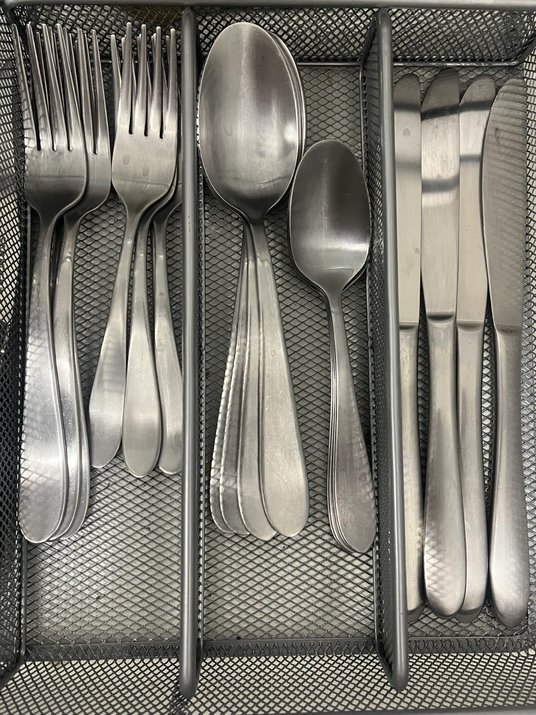 A set of stainless steel cutlery including a ×4 large and small forks, spoons, and knives. All pieces are made from durable stainless steel. Great for everyday use at the dinner table!