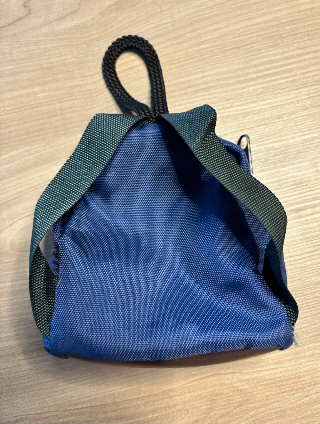 This is a blue zippered pouch bag with a front pocket and a loop for hanging. It has a small faux leather diamond detail on the front. The material appears to be durable nylon. Great for carrying small items like coins or earbuds!