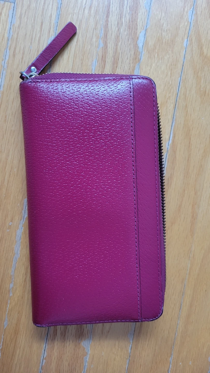 This Kate Spade New York wallet is crafted from magenta pebbled leather with a zip-around closure. It's designed with multiple interior compartments and card slots for organization. A great wallet for everyday use! Gently used.