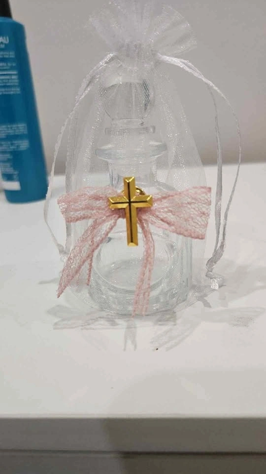 Cute set of 4 mini glass bottles, perfect for favors. Has little stoppers for each bottle. Comes with gold cross charms, pink lace ribbons, and white organza bags. Great for DIY baptism or communion favors. Price: $6 CASH ONLY. Meet Location: Pickering.