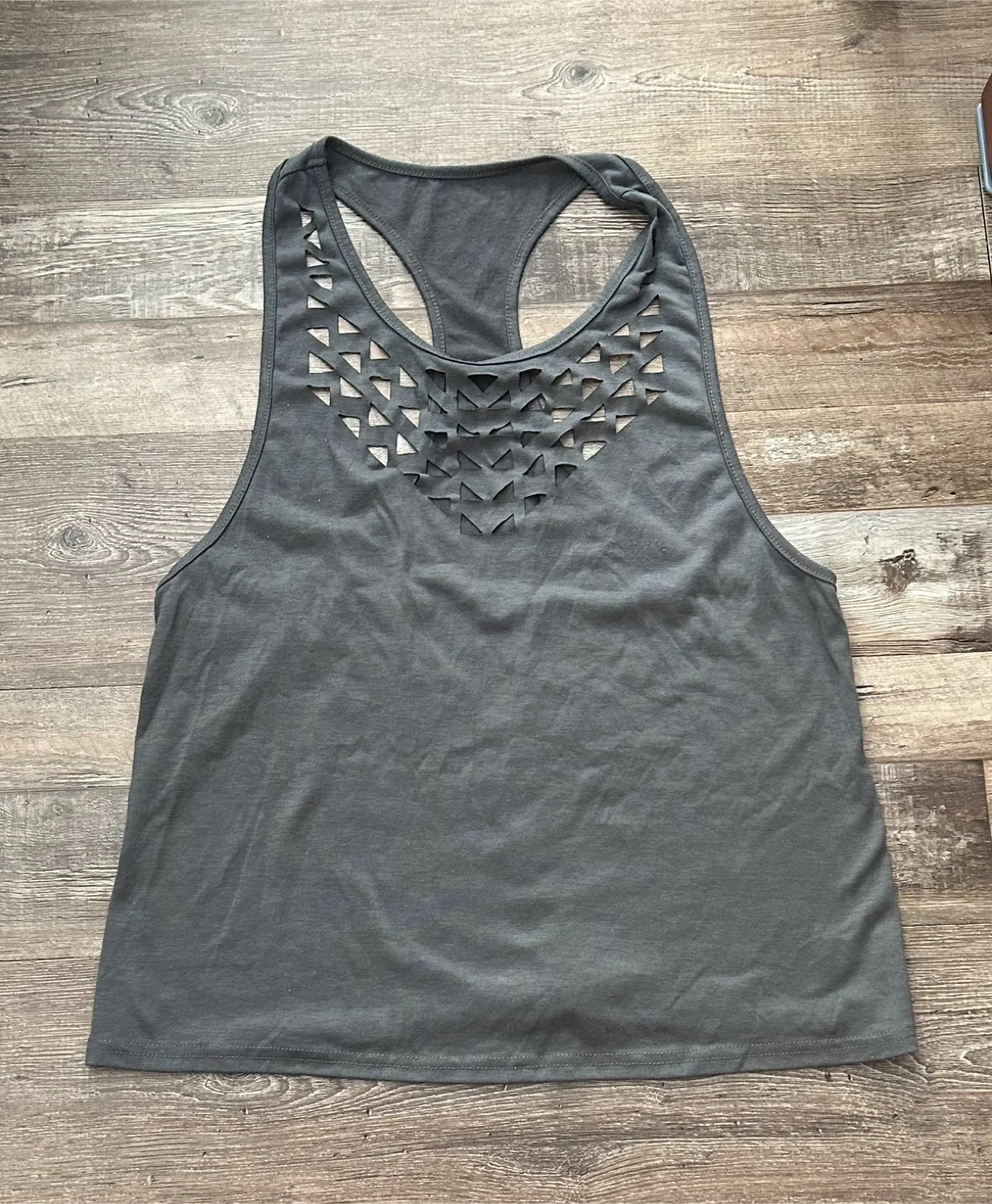 Grey lightly worn racerback tank top. Features a stylish cutout design on the upper back. Soft, comfortable fabric.