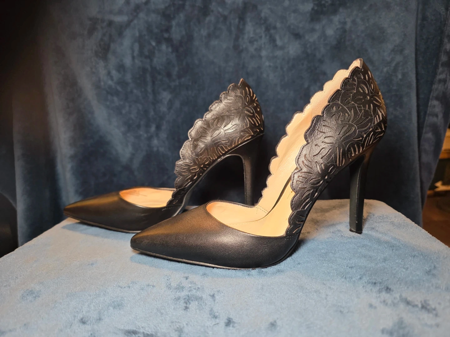 Selling a pair of Jessica Simpson black heels in size 6.5. These stylish shoes feature a unique floral design around the edges. They are in great condition and ready for a new home!