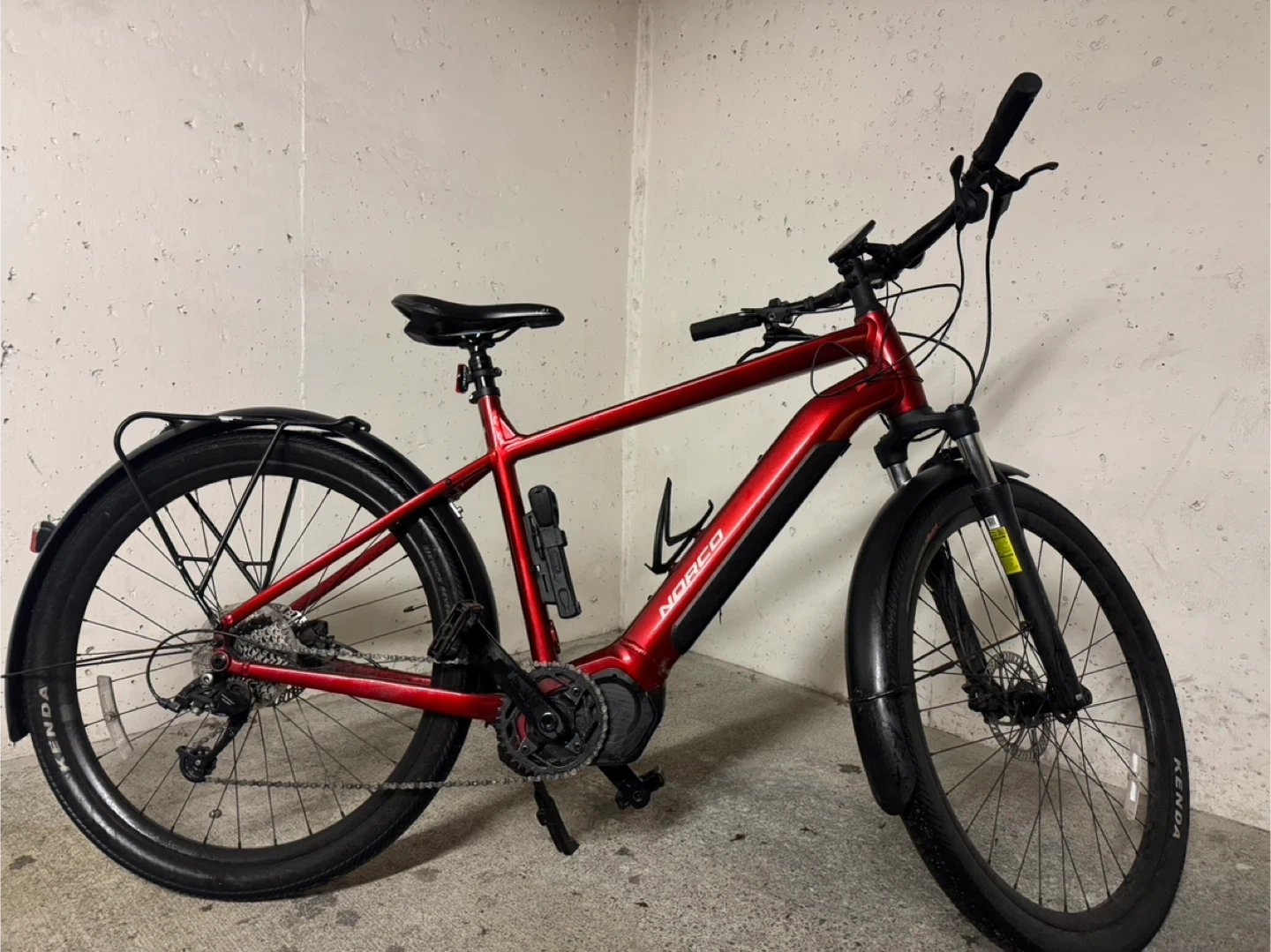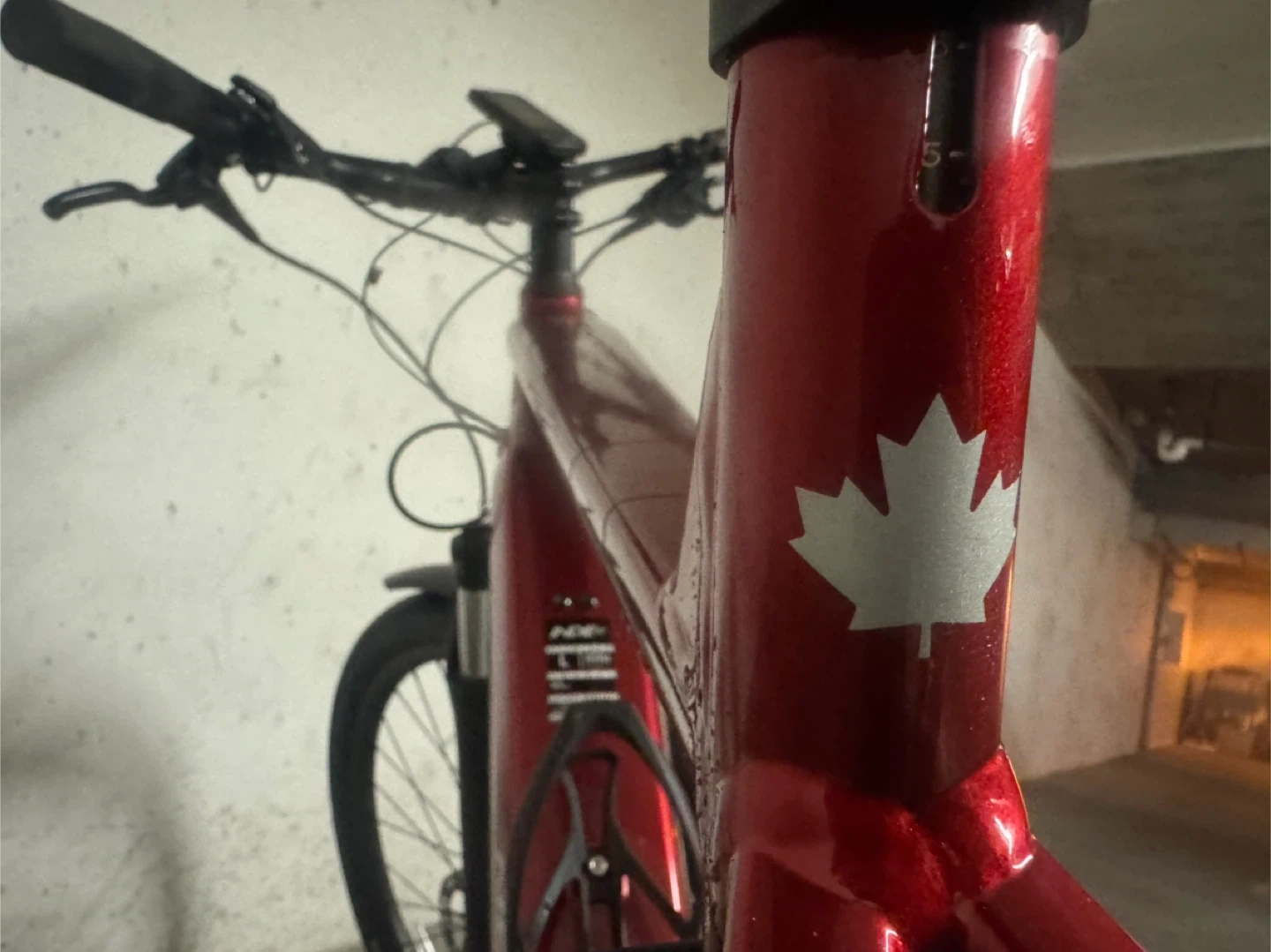 Red Norco electric bike with a Canadian maple leaf decal. It has travelled 2040.7 km. Features include fenders and front/rear lights. Ready for your next ride!