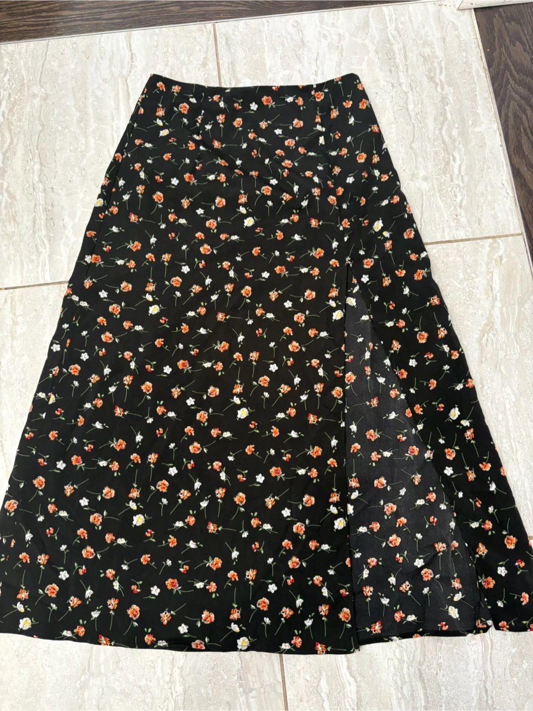 Super cute black floral skirt in size Small. Features a delicate orange and white floral print that stands out beautifully against the black background. The flowy, A-line style is very flattering and easy to wear, and it has a subtle side slit that adds a stylish touch.