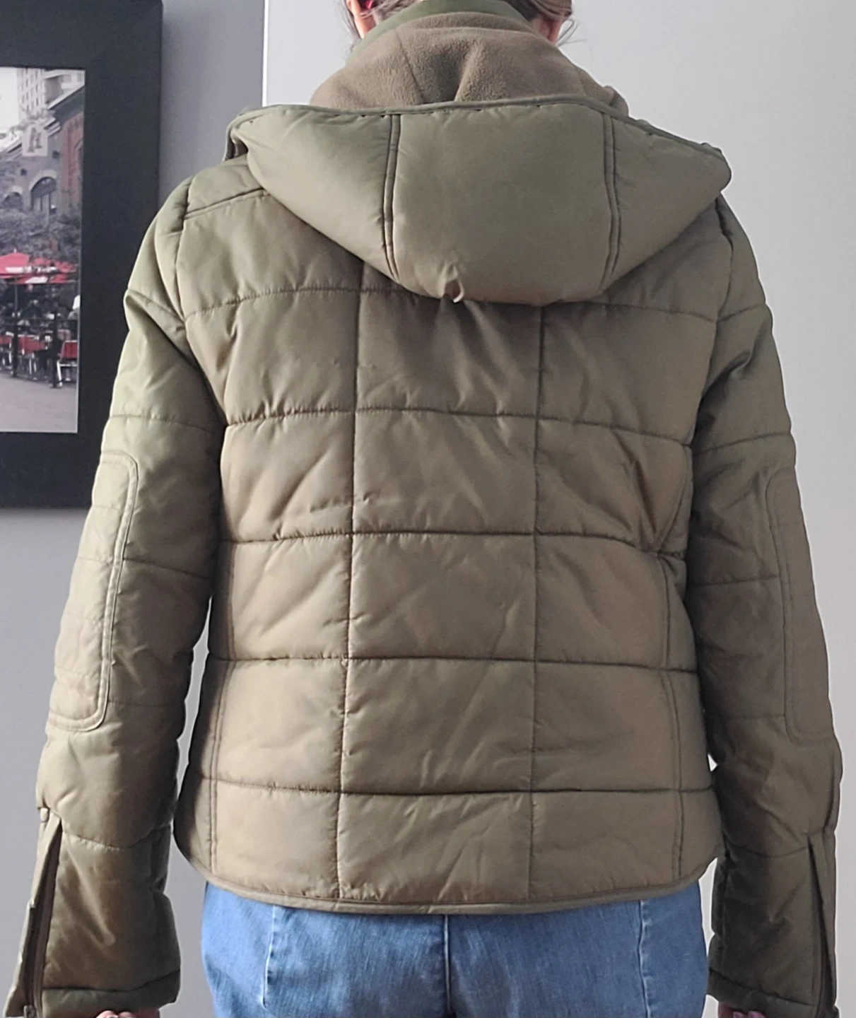 This olive green puffer jacket is perfect for staying warm and stylish! It features a quilted design and a cozy hood. It's in great condition and ready for a new owner