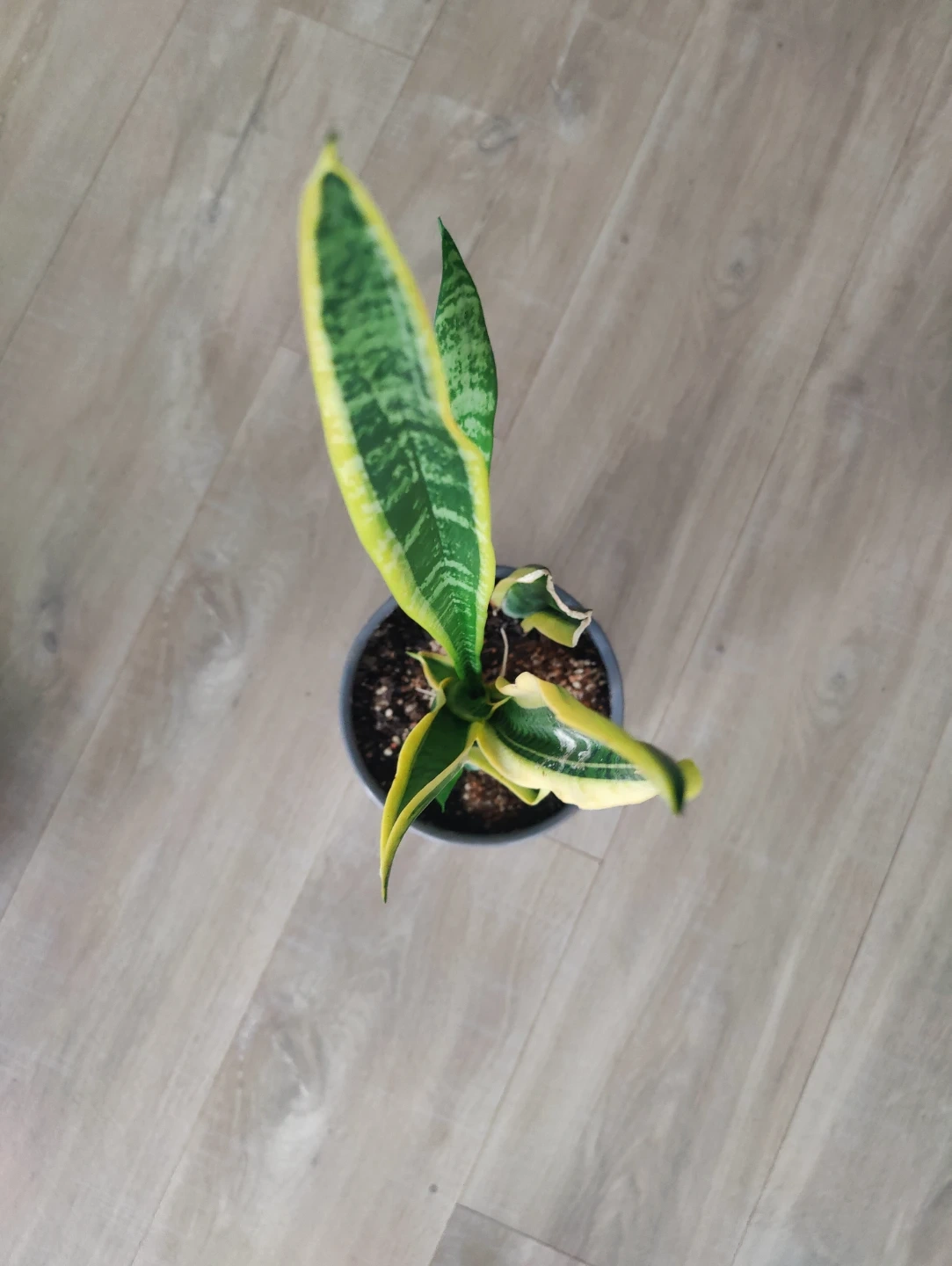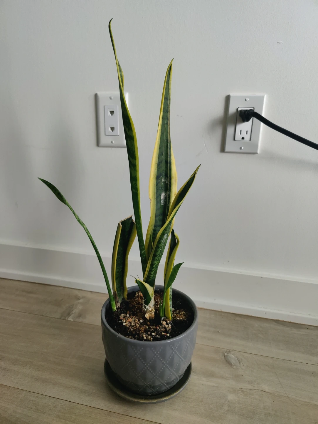A snake plant in a decorative grey pot. It's easy to care for and adds a touch of green to any space. Needs minimal watering and indirect sunlight.